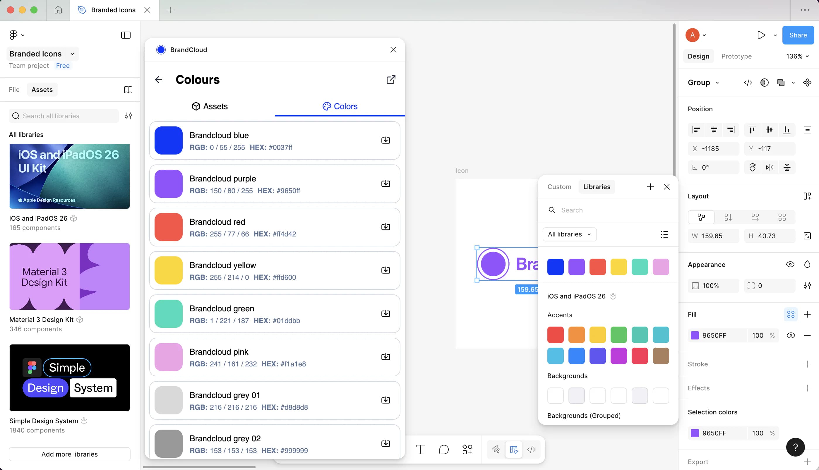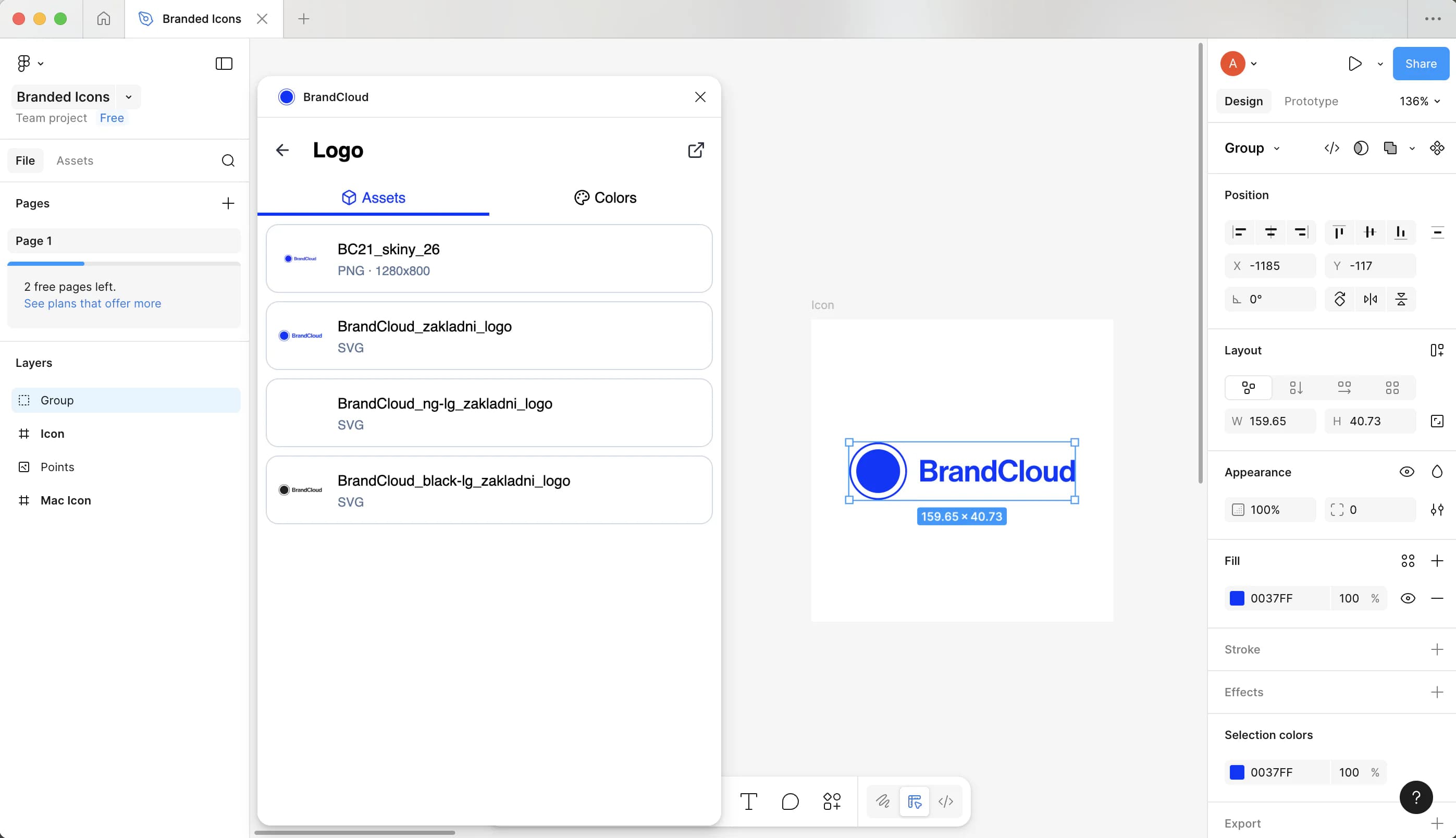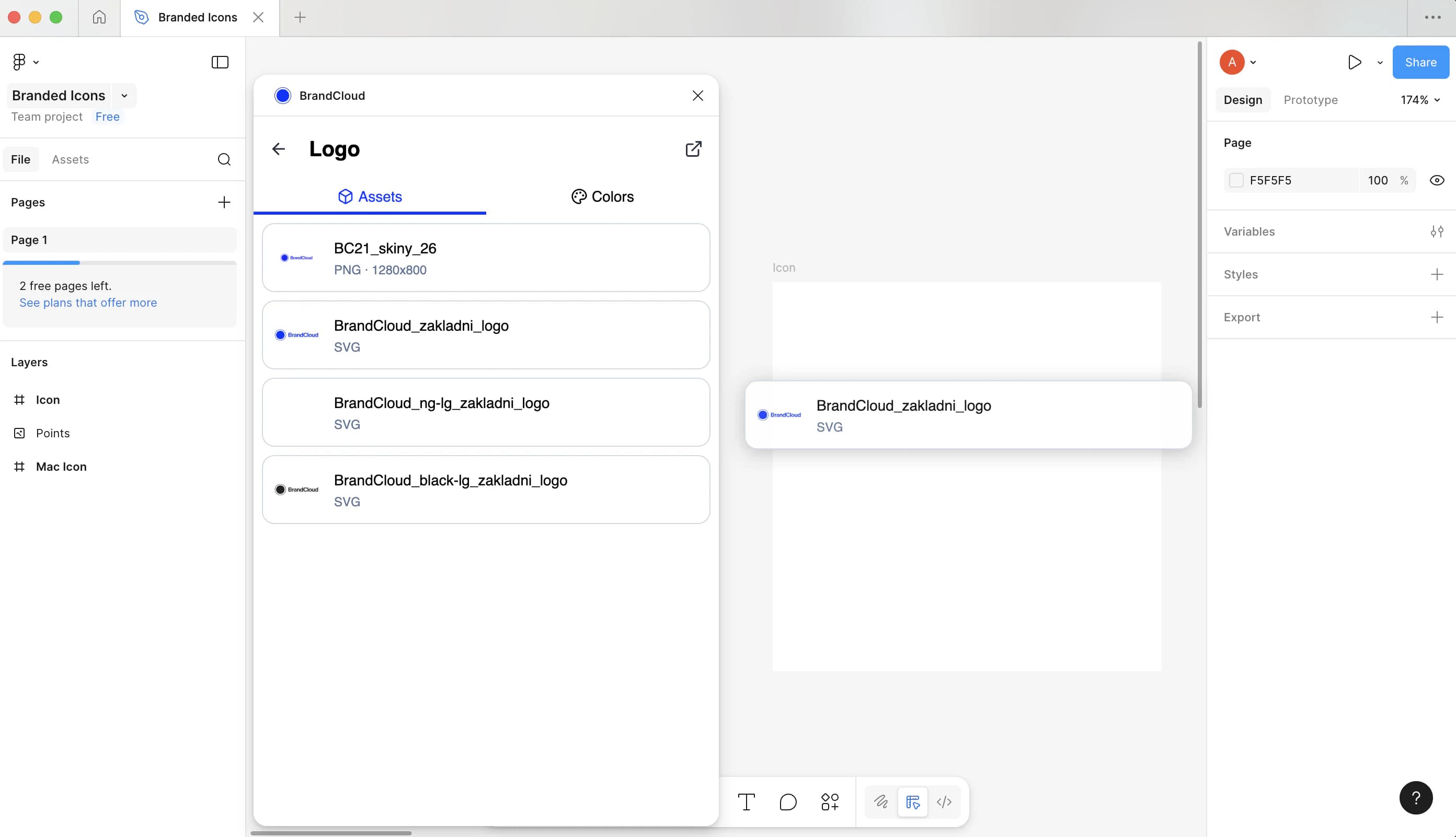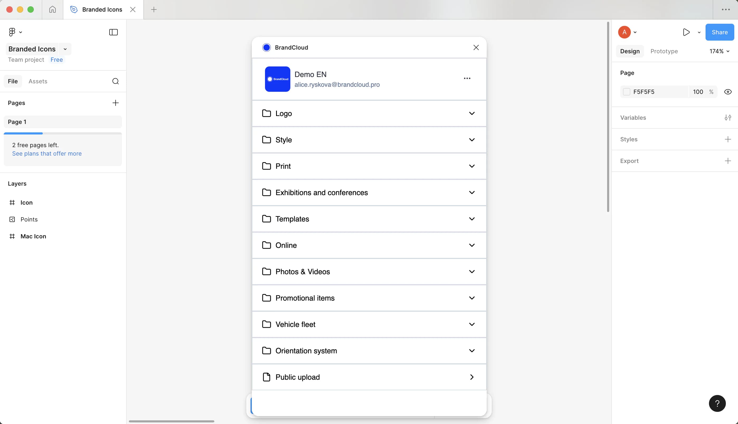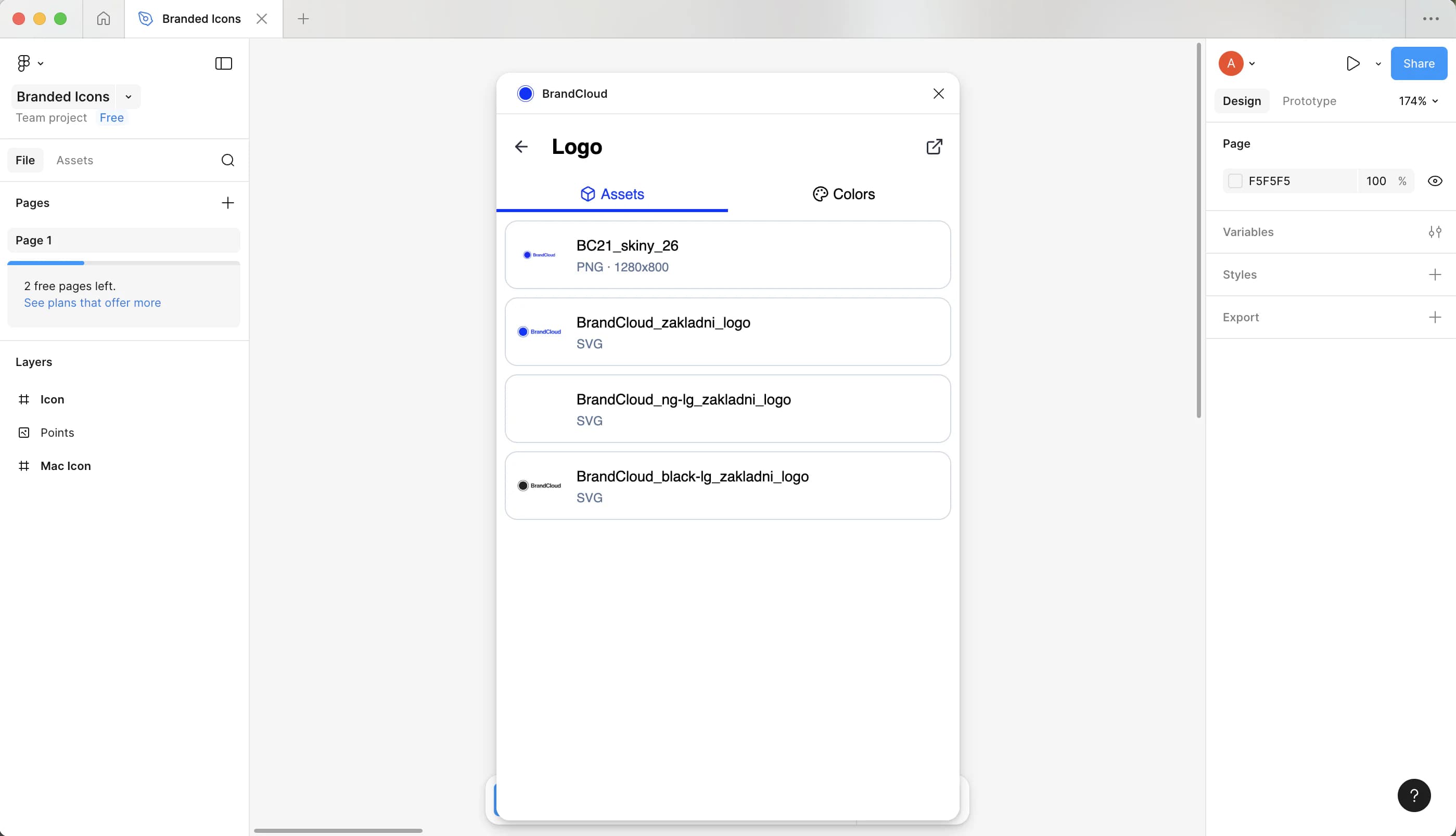 5. Po přihlášení se ti ve Figmě zpřístupní stromová struktura tvého BrandCloudu. Tam už můžeš hledat všechny assety, se kterými potřebuješ ve Figmě pracovat.