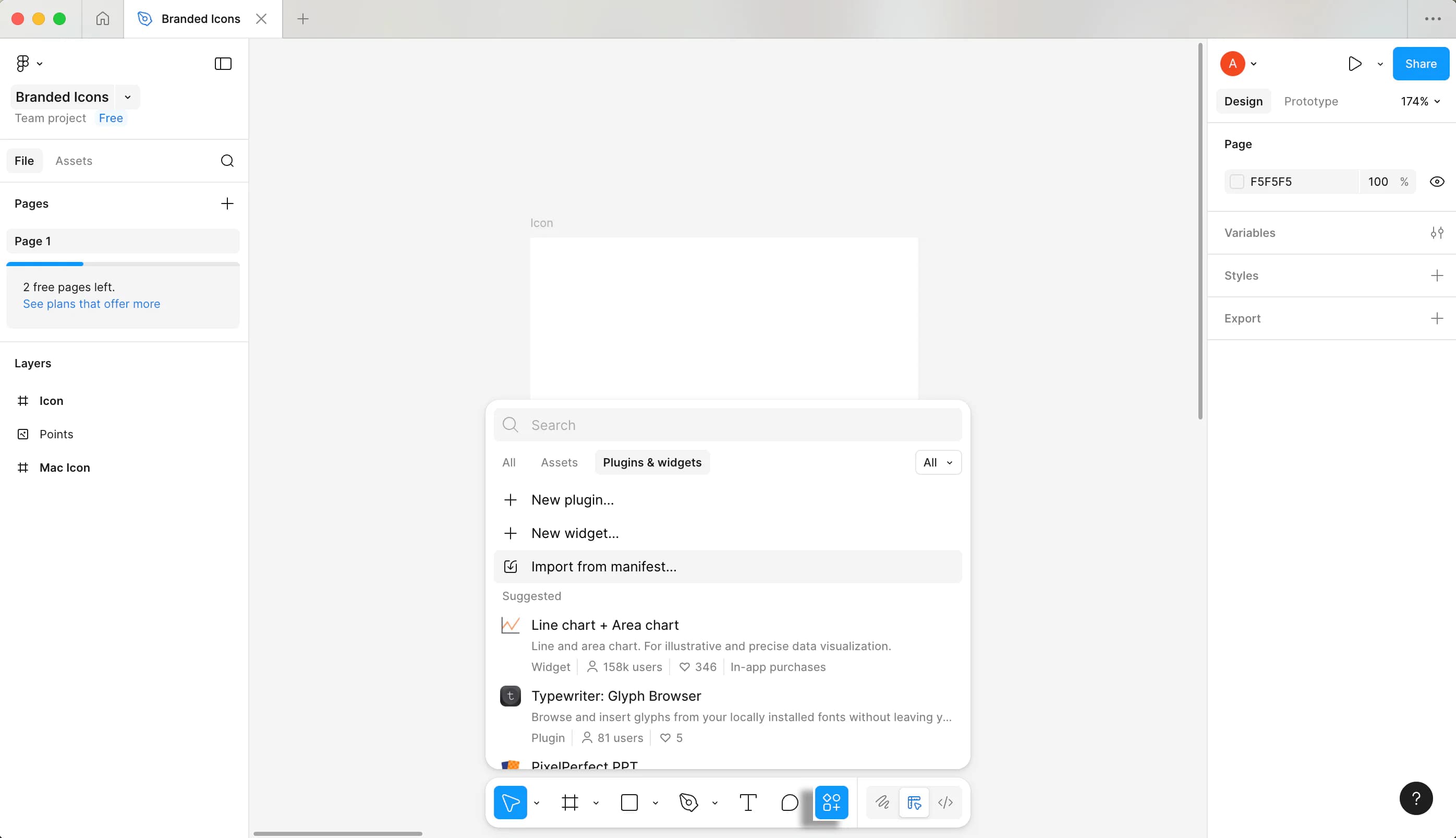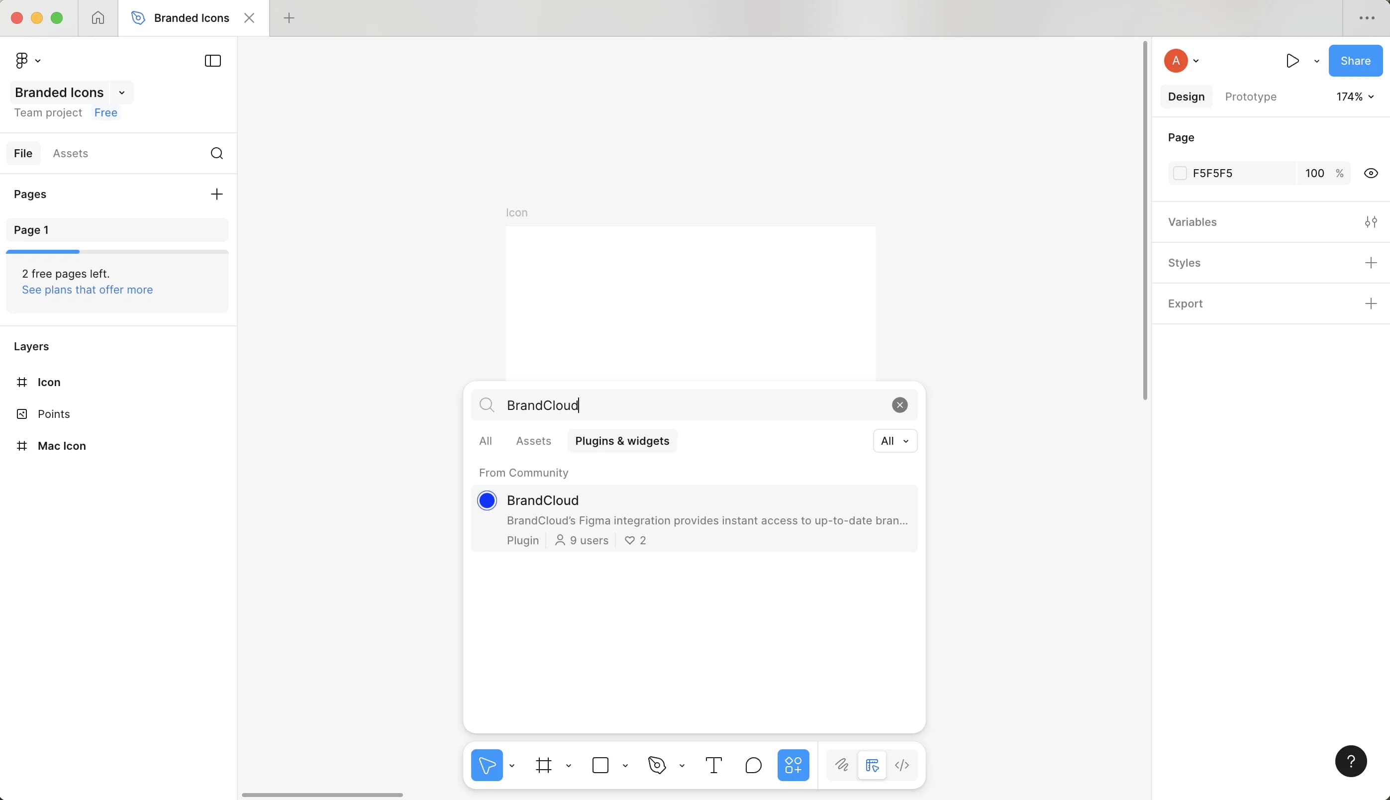 Přihlas se do Figmy a ve spodní liště otevři sekci Actions, kde budeš plugin BrandCloudu hledat.