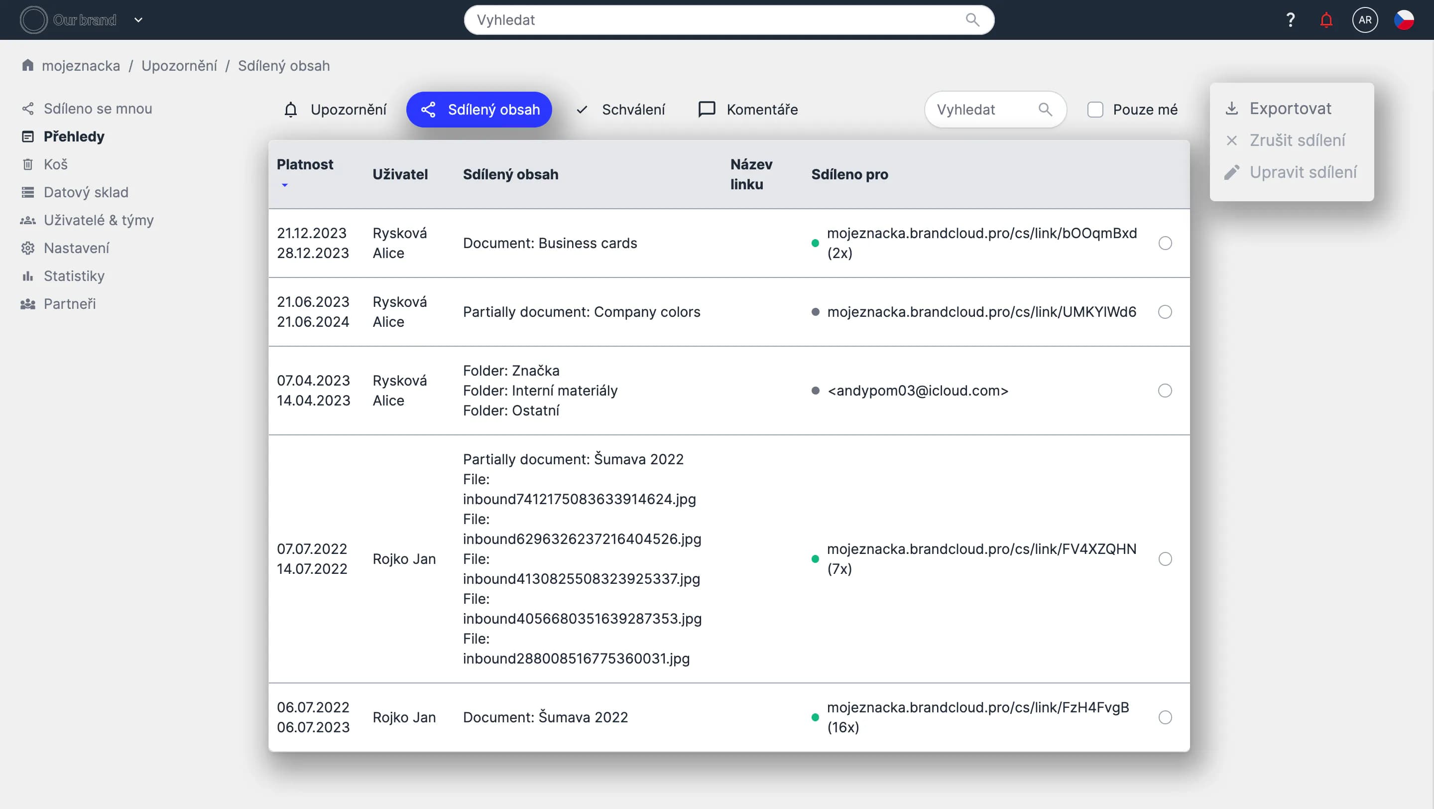 - Exportovat – exportuje přehled všech sdílení včetně souvisejících dat.