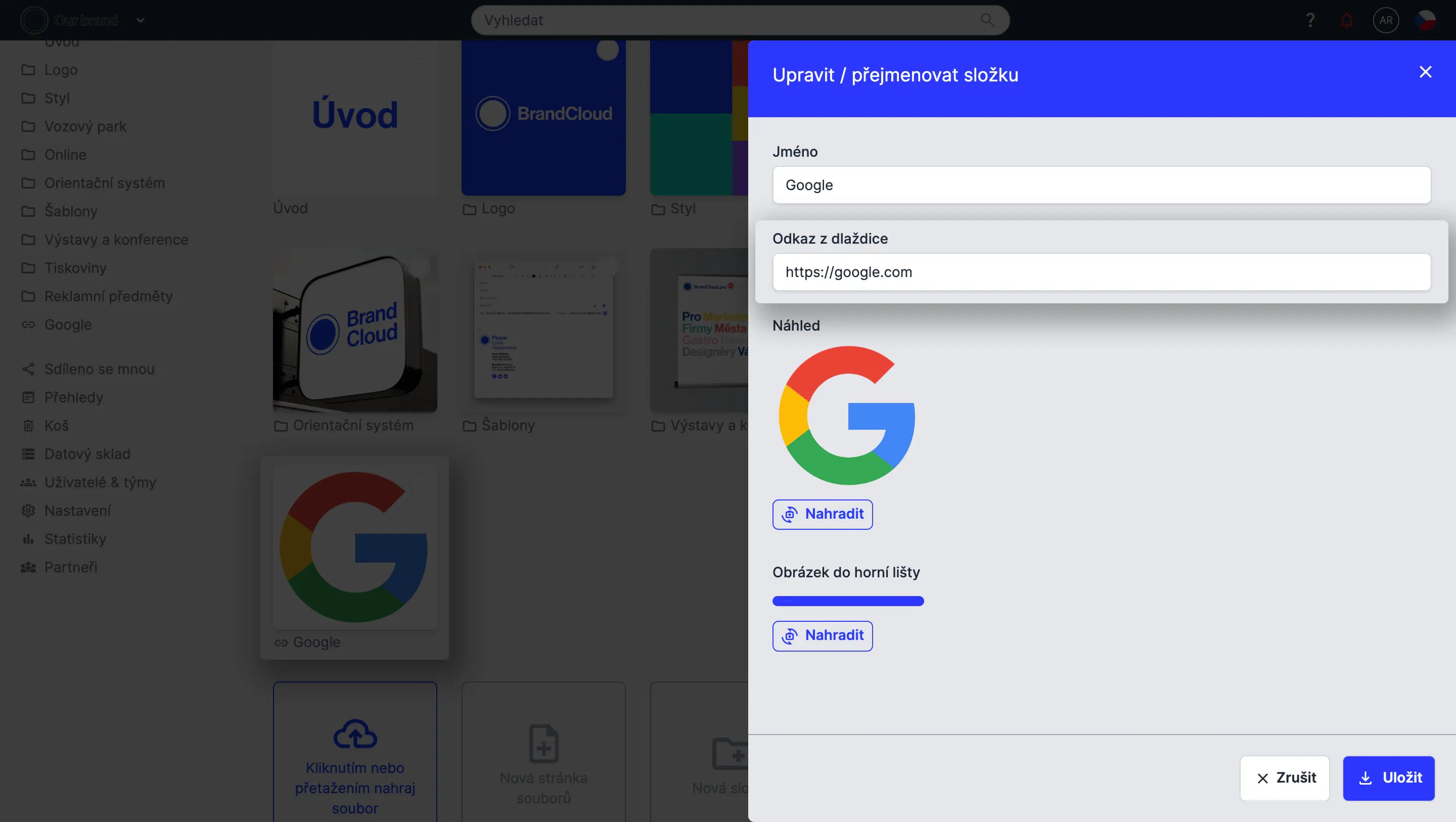 Složku můžeš upravit tak, aby její název a vzhled odpovídaly nastavení BrandCloudu. Složku lze také přeměnit na odkaz.