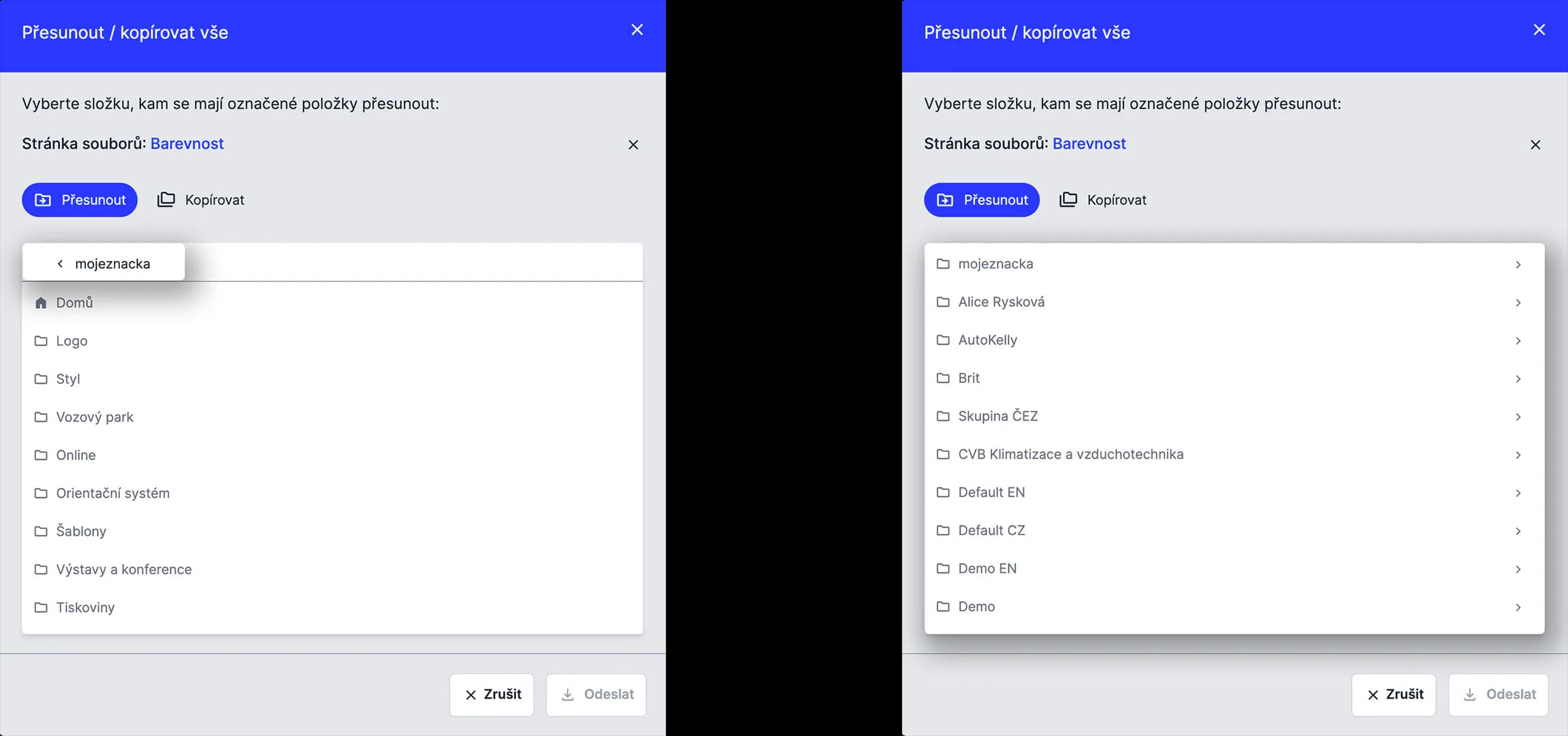 Přesouvat nebo kopírovat obsah mezi dvěma BrandCloudy můžeš pouze v těch, kde máš editační práva. Přístup je omezen na struktury, ke kterým máš oprávnění.