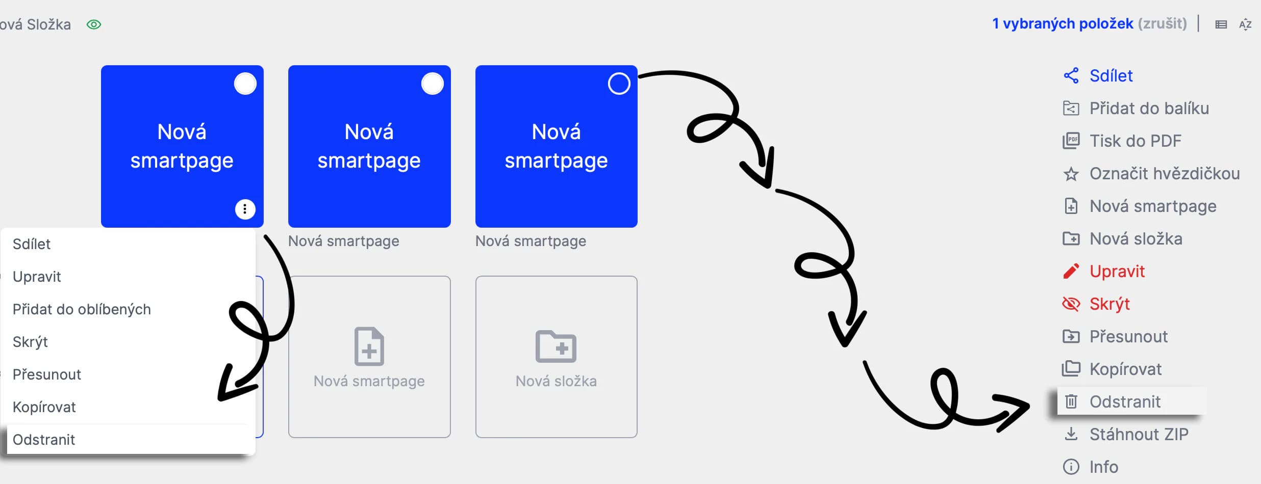 Pro přesunutí celé smartpage do koše postupujte následovně: