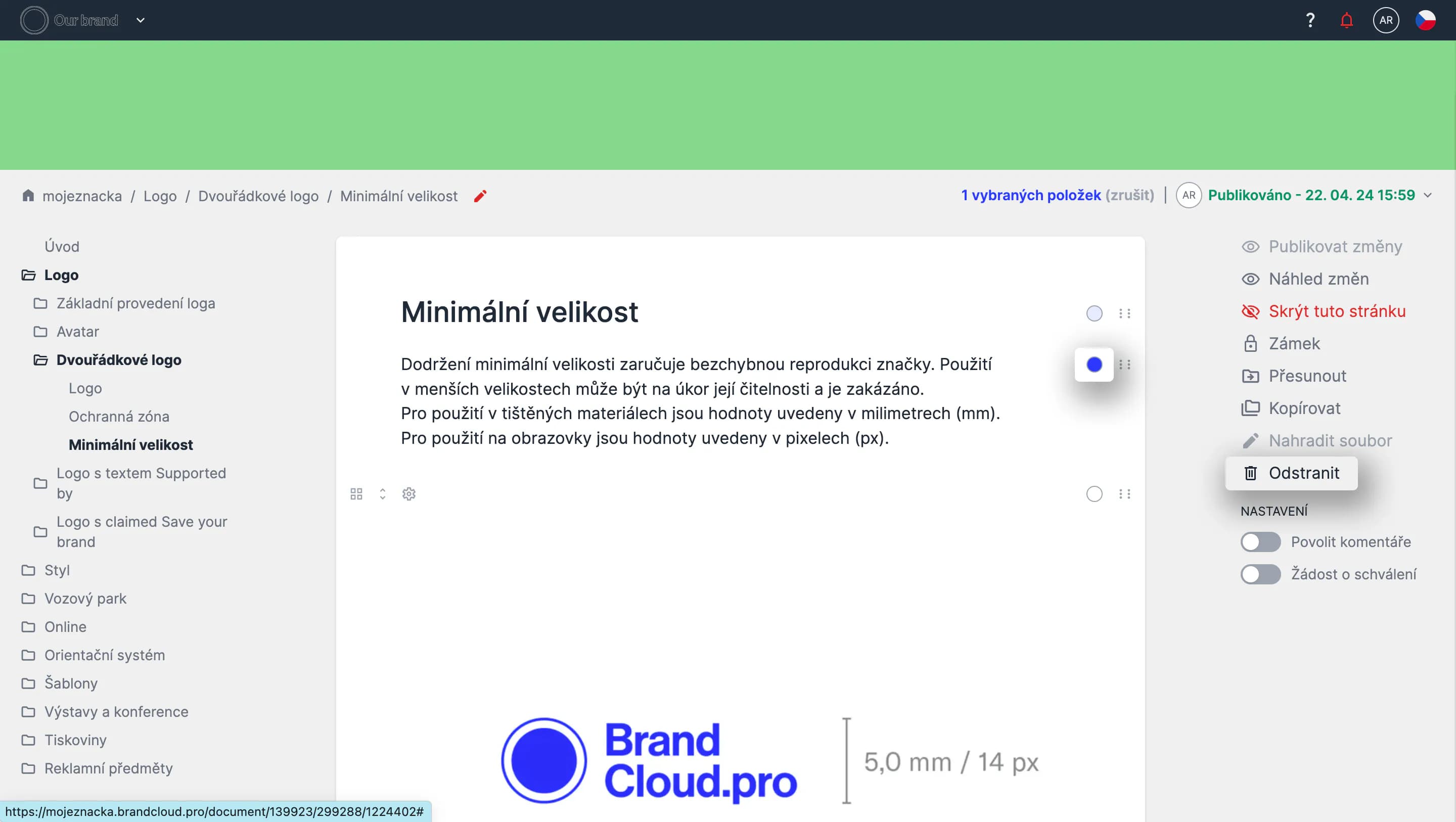 - V pravém panelu se zpřístupní tlačítko Odstranit. Kliknutím element smažeš.