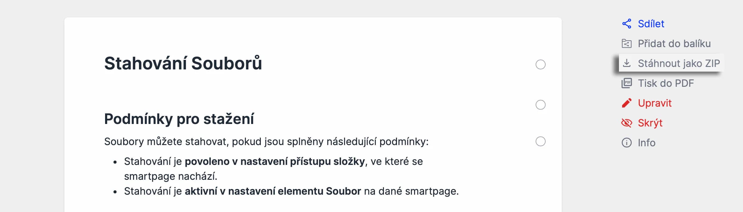 - Stahování je aktivní v nastavení elementu Soubor na dané smartpage.