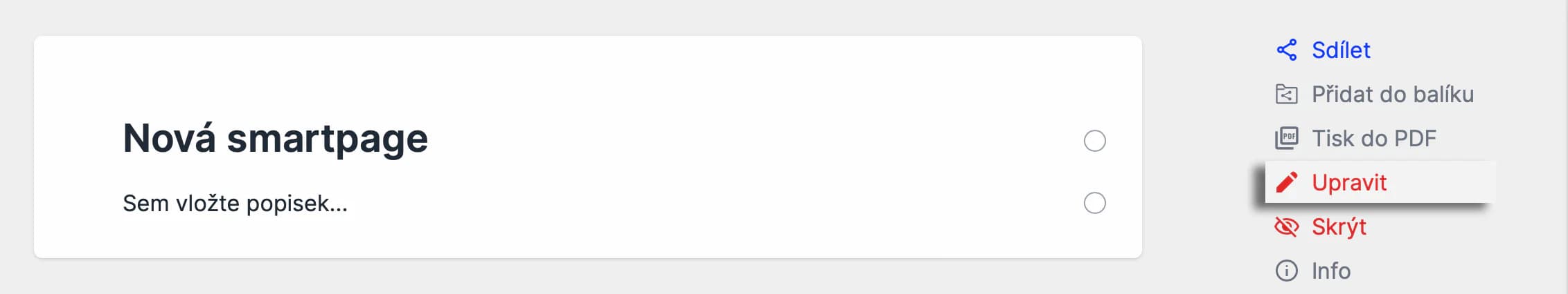 V pravém panelu smartpage najdete tlačítko Upravit. Kliknutím přejdete do editačního módu.