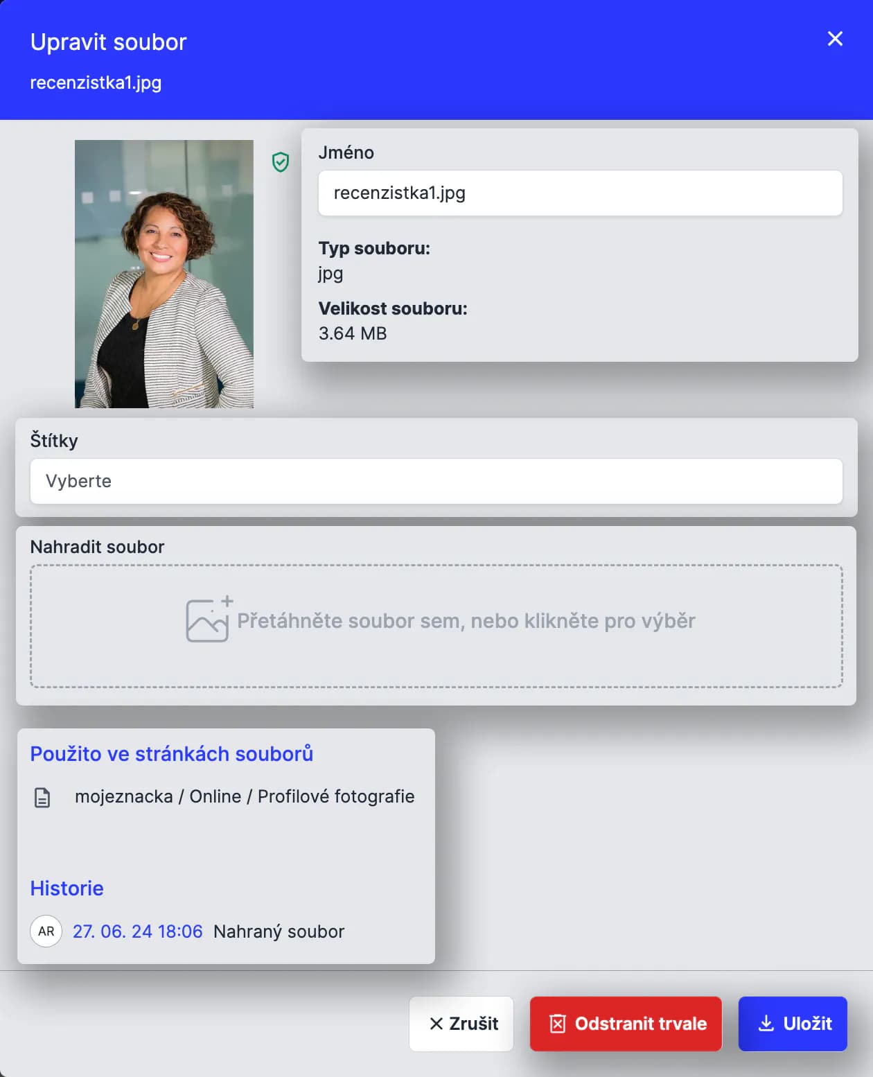 - Nahradit soubor – původní soubor se automaticky aktualizuje také na všech smartpages, kde je použitý