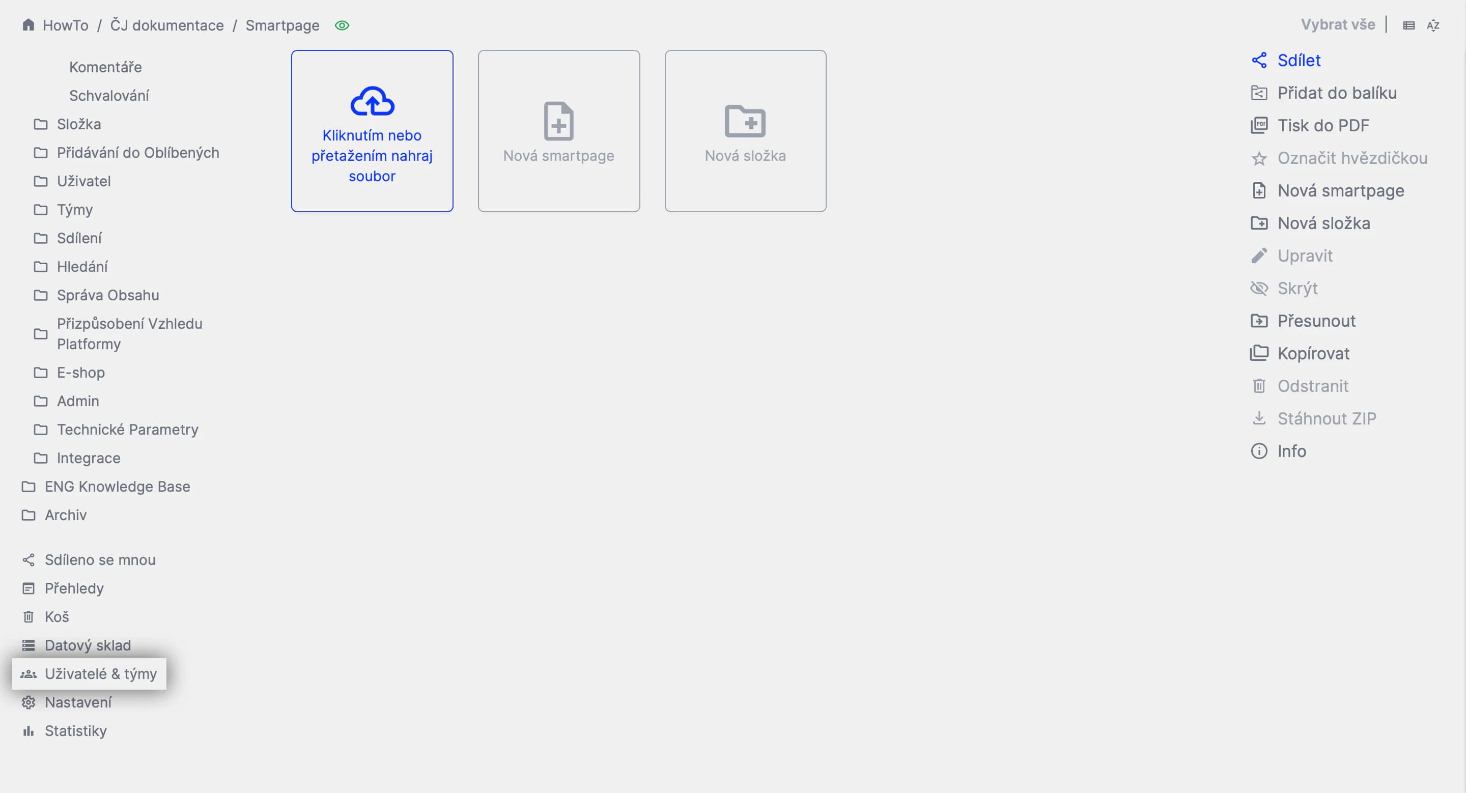 - V pravém sloupci najdete možnosti pro správu týmu a jeho uživatelů.