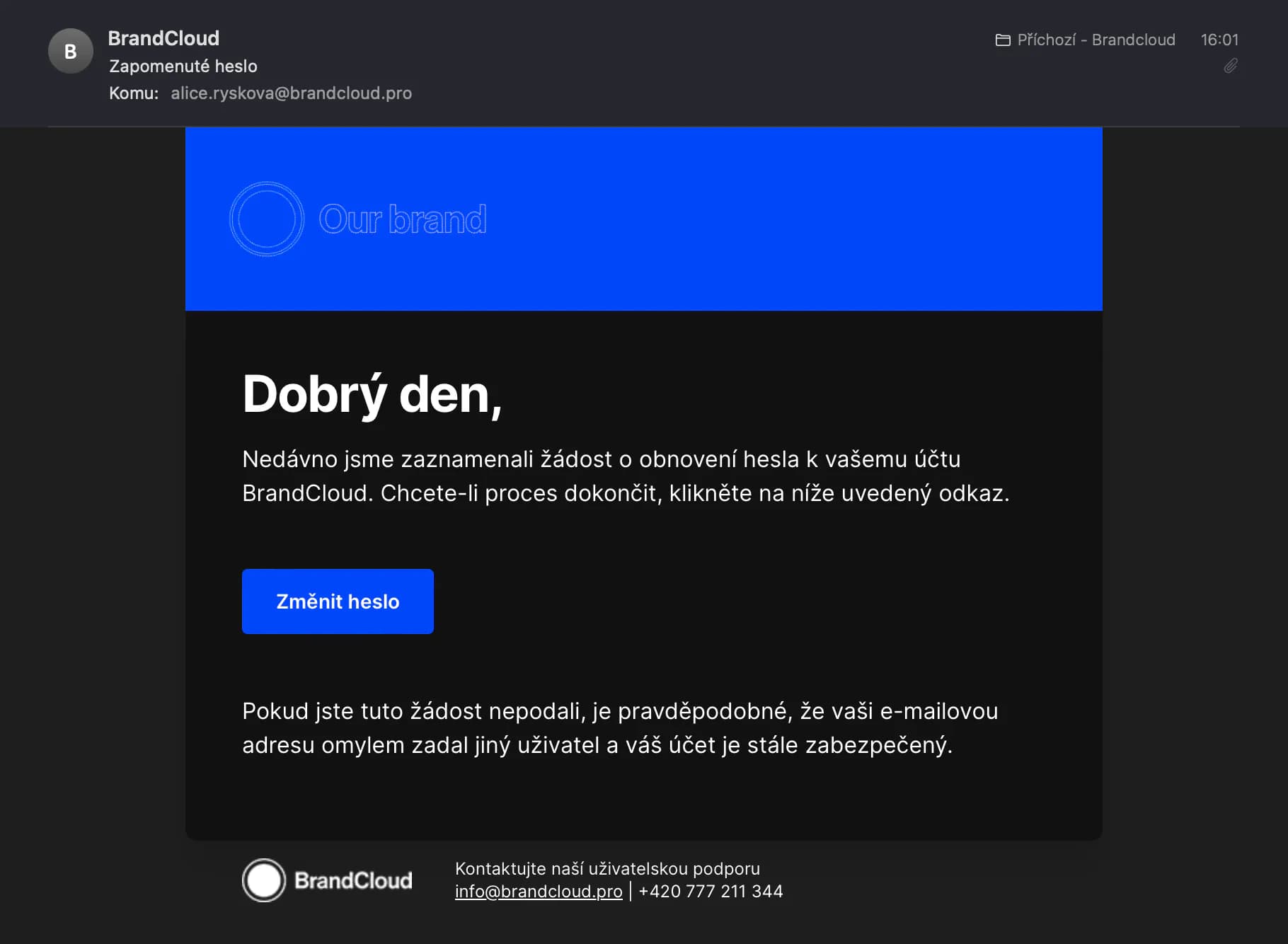 - Ujisti se, že jsi použil e-mailovou adresu propojenou s tvým účtem BrandCloud. Pokud jsi zadal jinou adresu, e-mail s odkazem na obnovení hesla nebude doručen.
