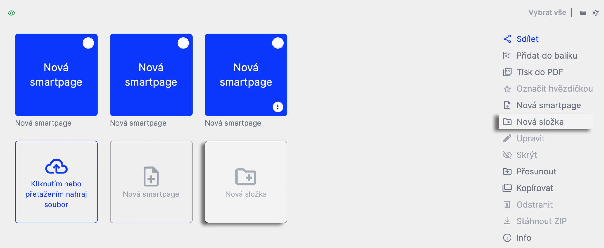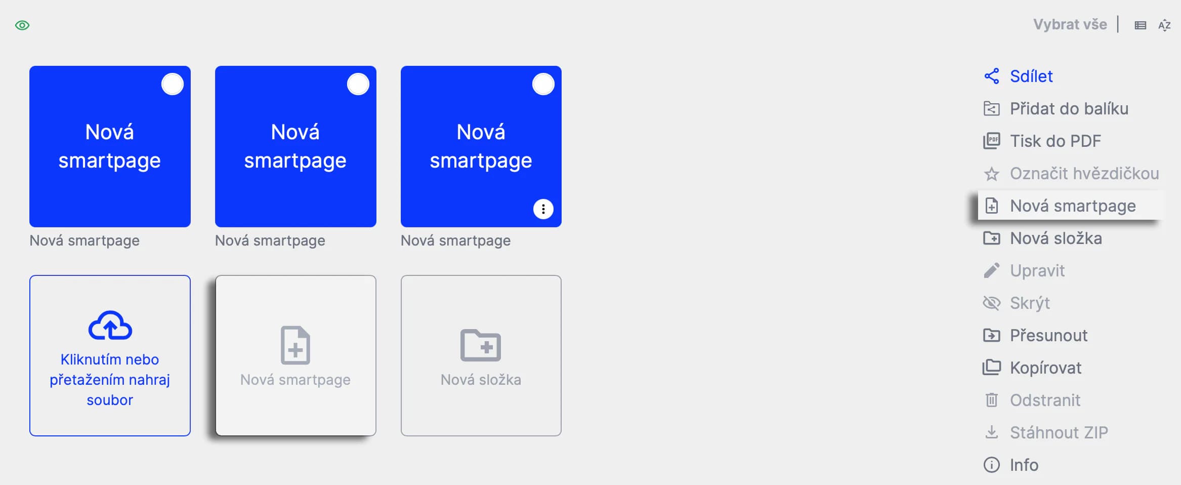 Dvě formy zobrazení obsahu: stromová a dlaždicová struktura. Obě slouží k organizaci souborů a smartpage uložiště.