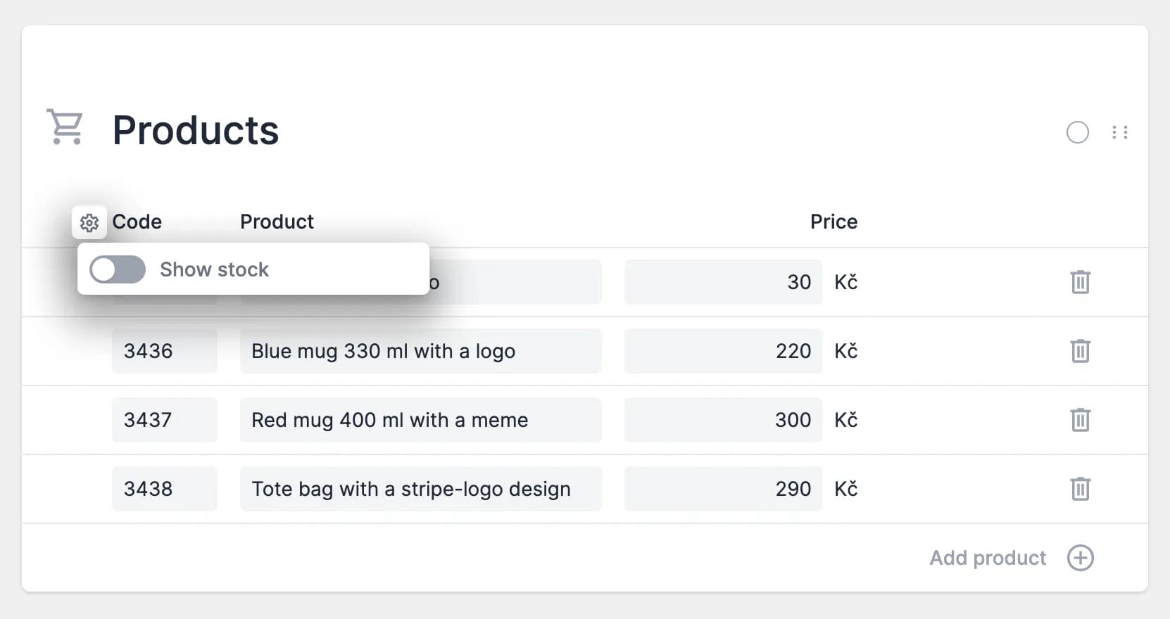 đź’ˇ In case you want to see the stock of your products, there is a toggle to display the stock status under the settings icon. The moment you have stocked these products, the exact number of available units will be displayed.