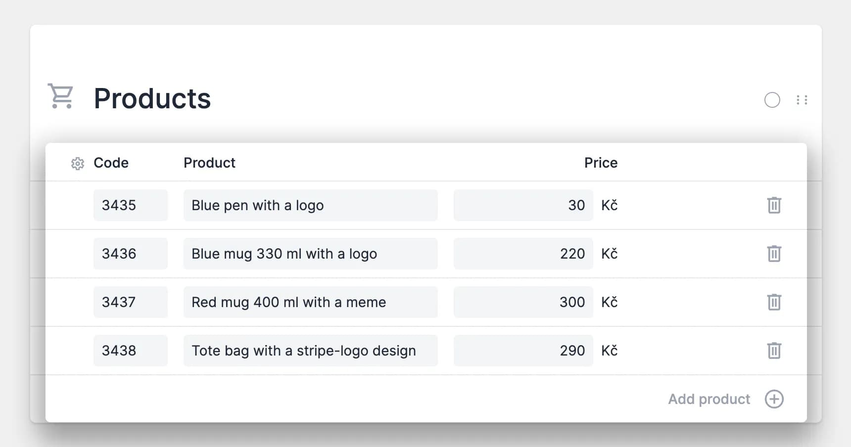 3. Then fill in any number of products and their details, i.e. the code (which you will need for stocking), name and price.