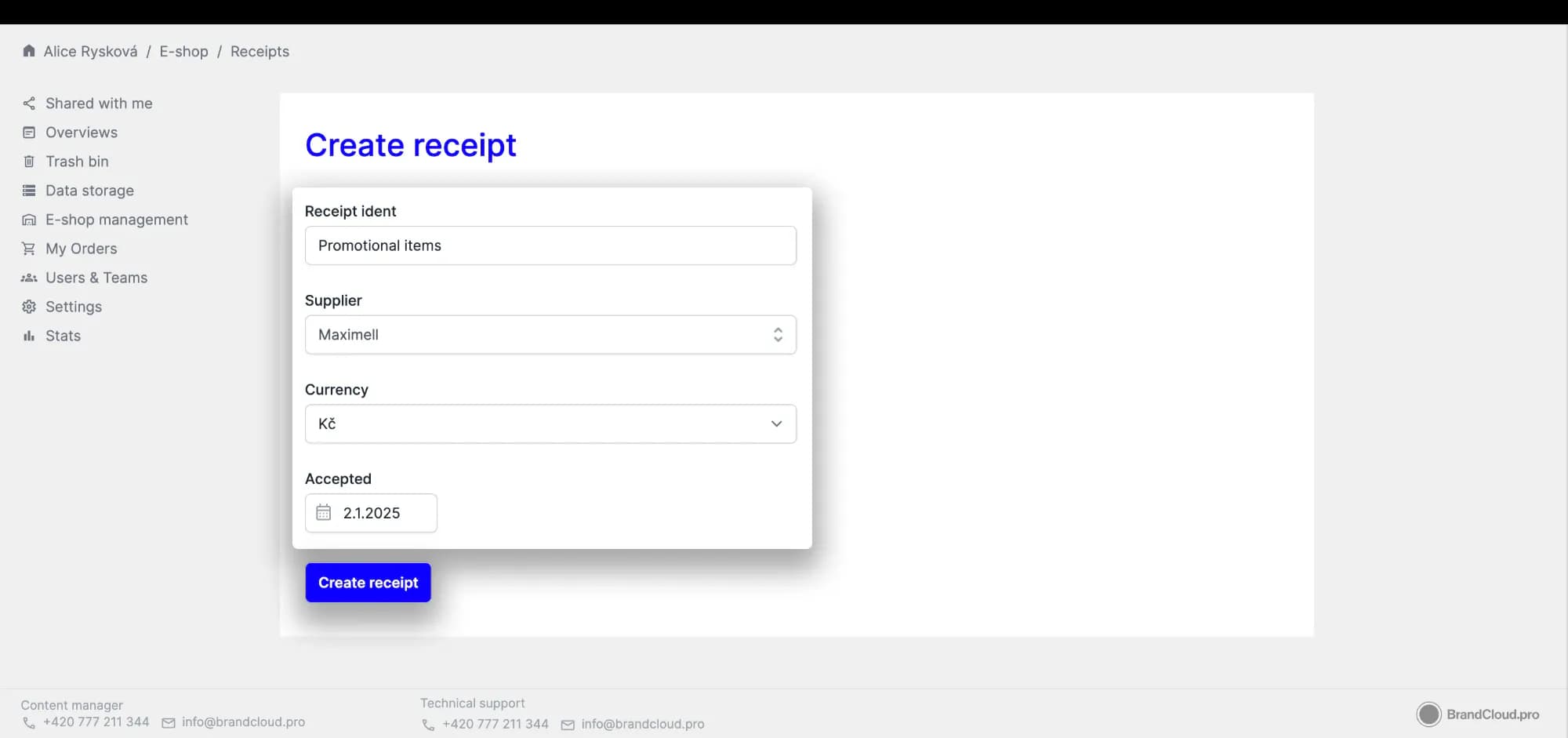 4. You will first be asked to enter basic details, i.e. Receipt ident, Supplier, Currency and Receipt Date. Once you have completed these, click the Create receipt button.