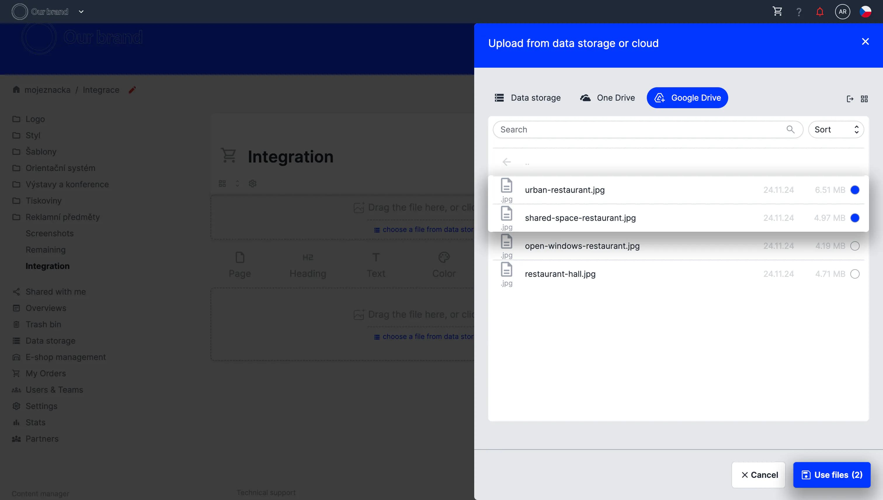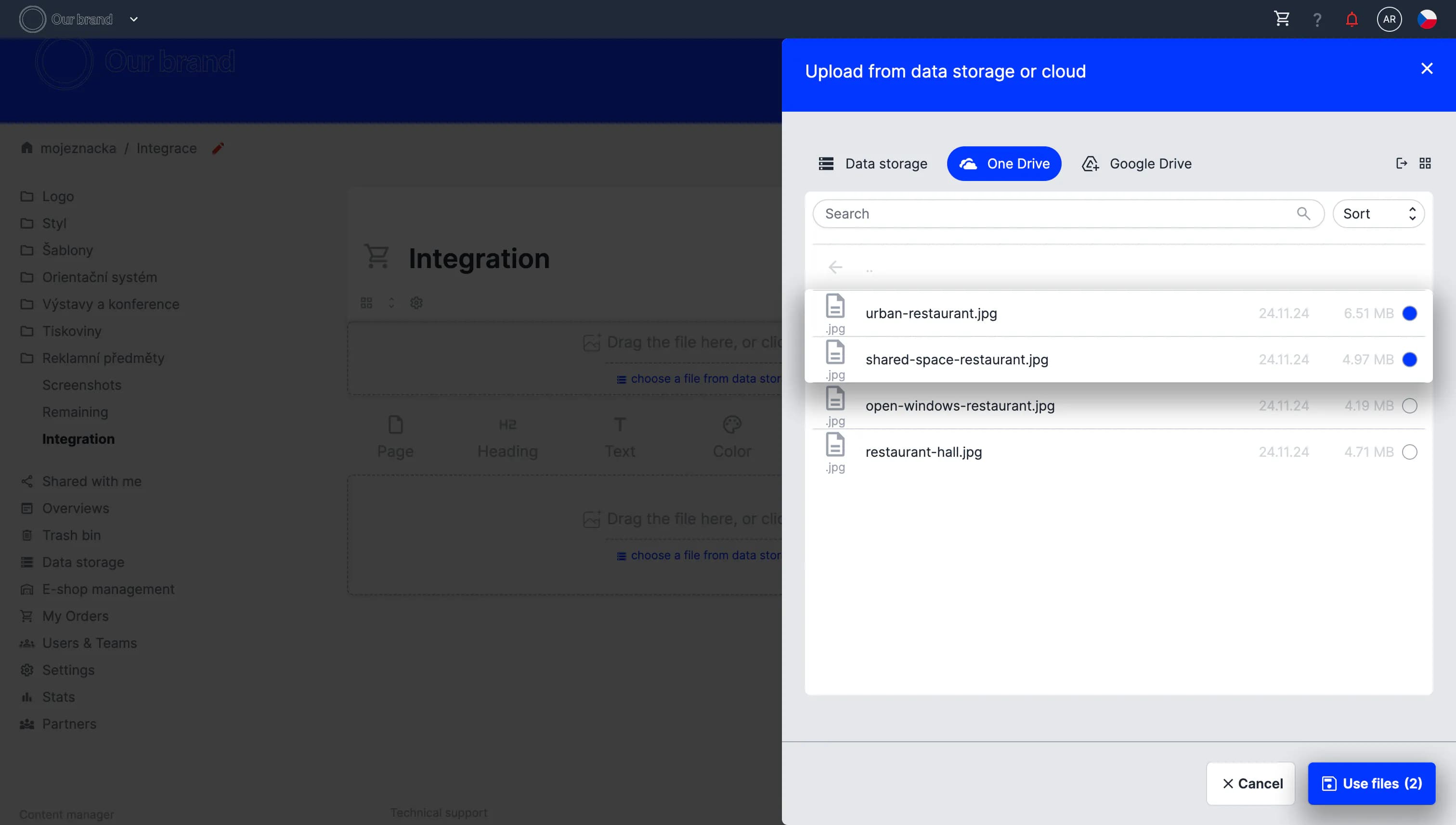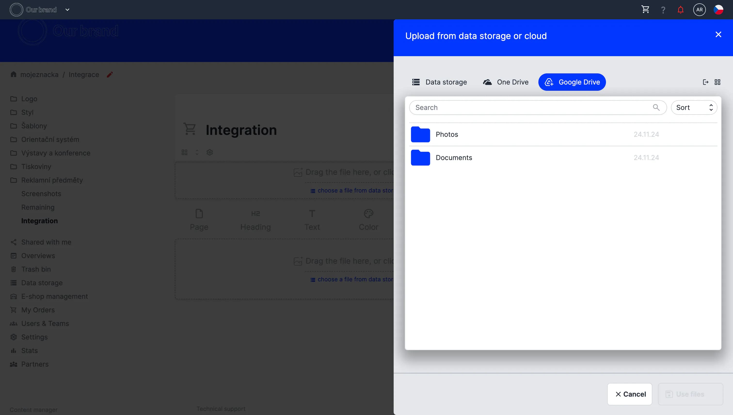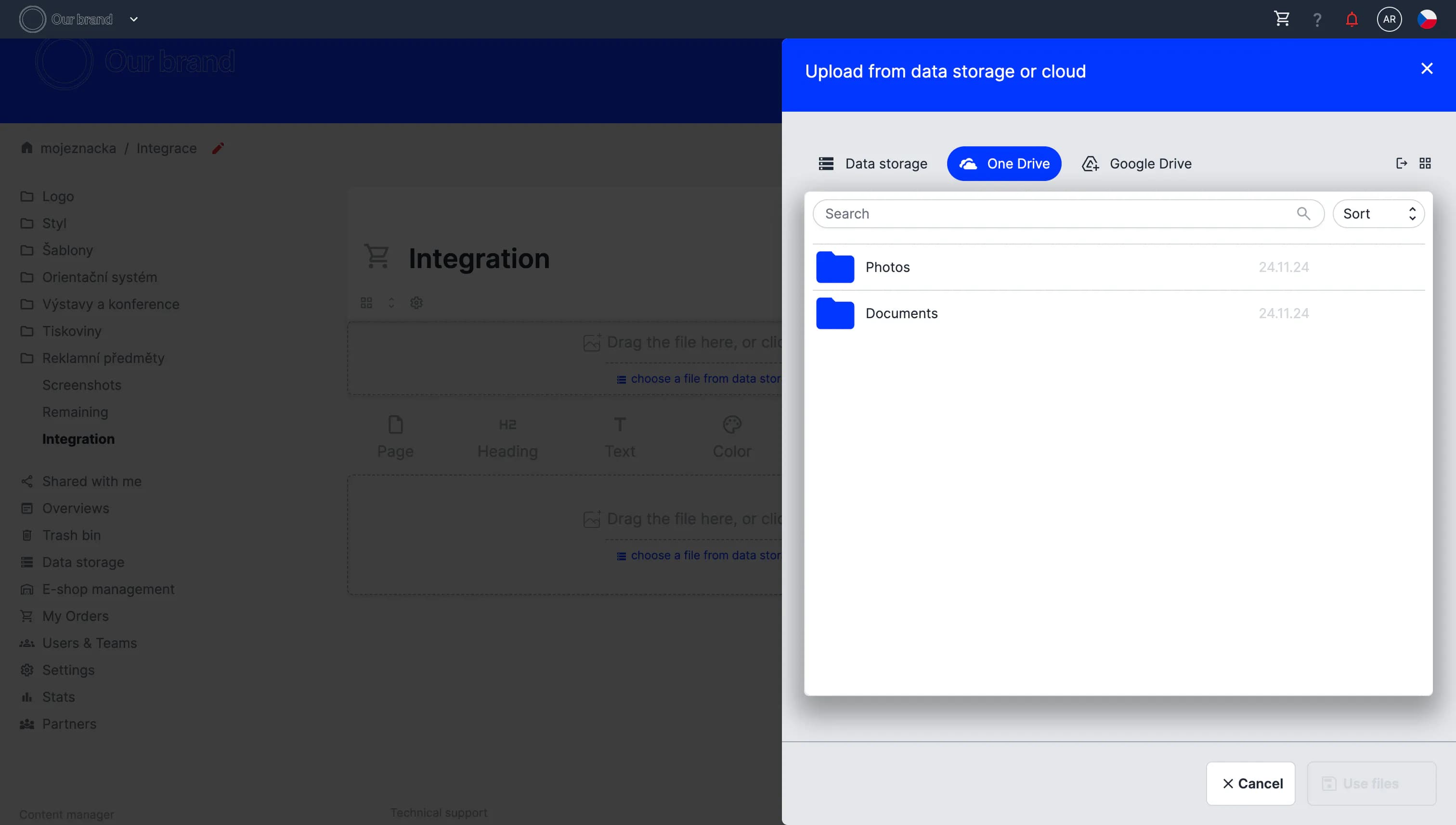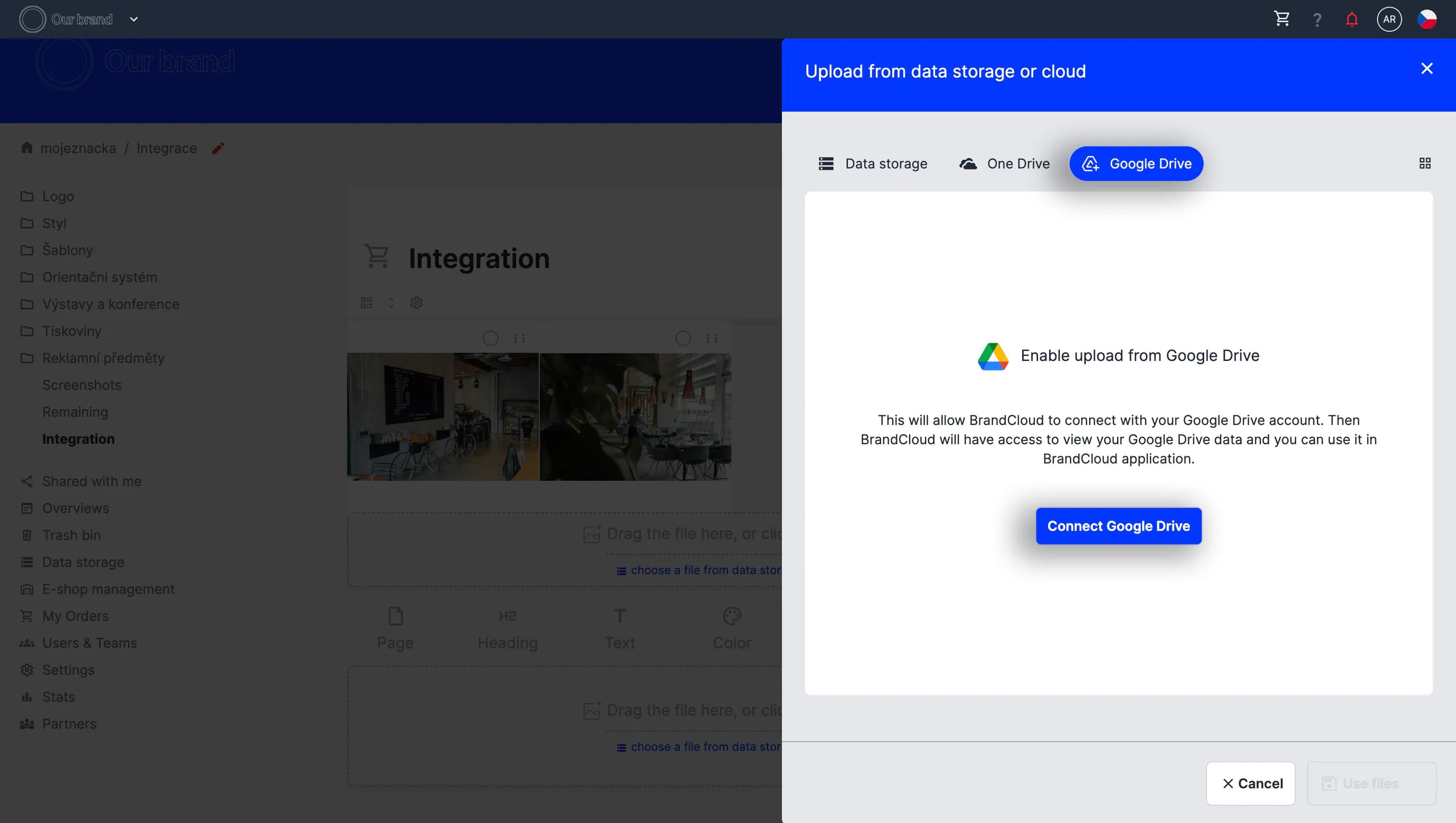 BrandCloud offers Google Drive and OneDrive cloud storage integrations. In case you use multiple platforms, you can therefore link them into one.