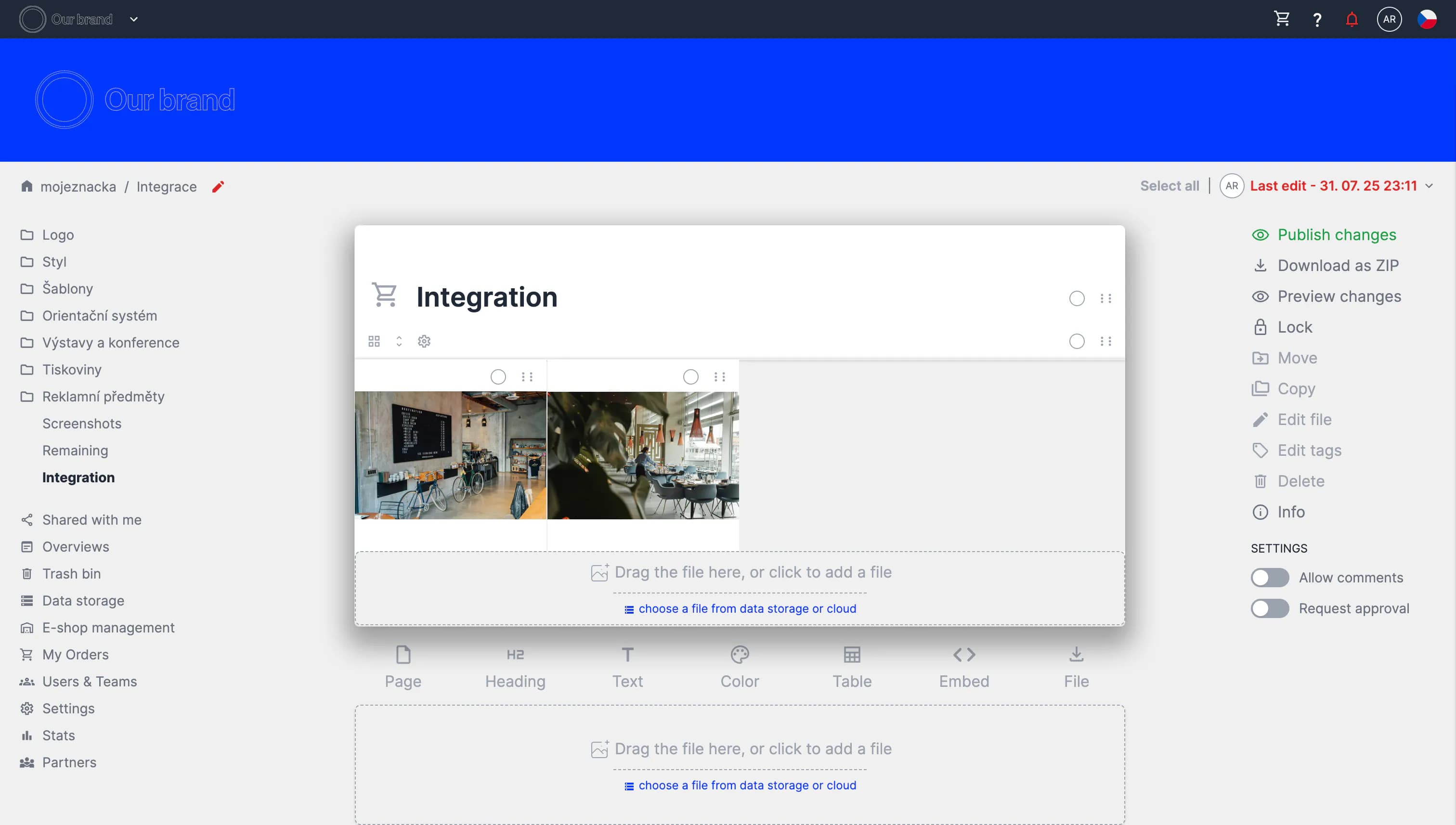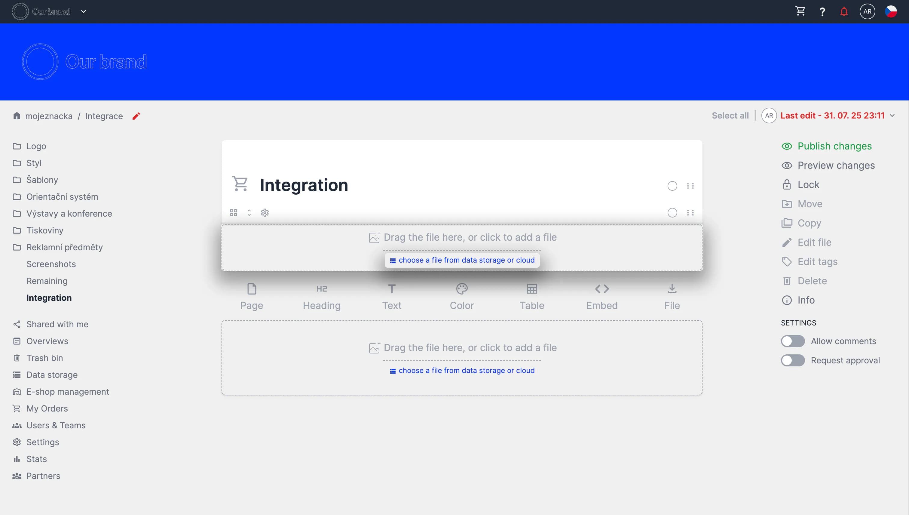 - Real-time changes are made immediately and automatically => uploaded content in Google Drive / OneDrive can be instantly uploaded to BrandCloud with a few clicks.