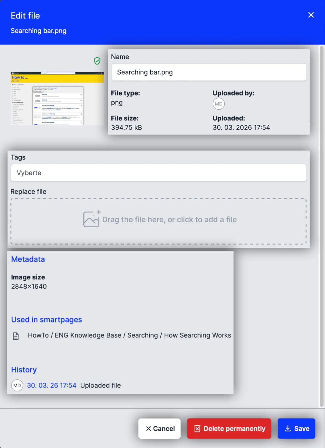 - Replace file → replaces the file in data storage and automatically updates it in every document where it is used