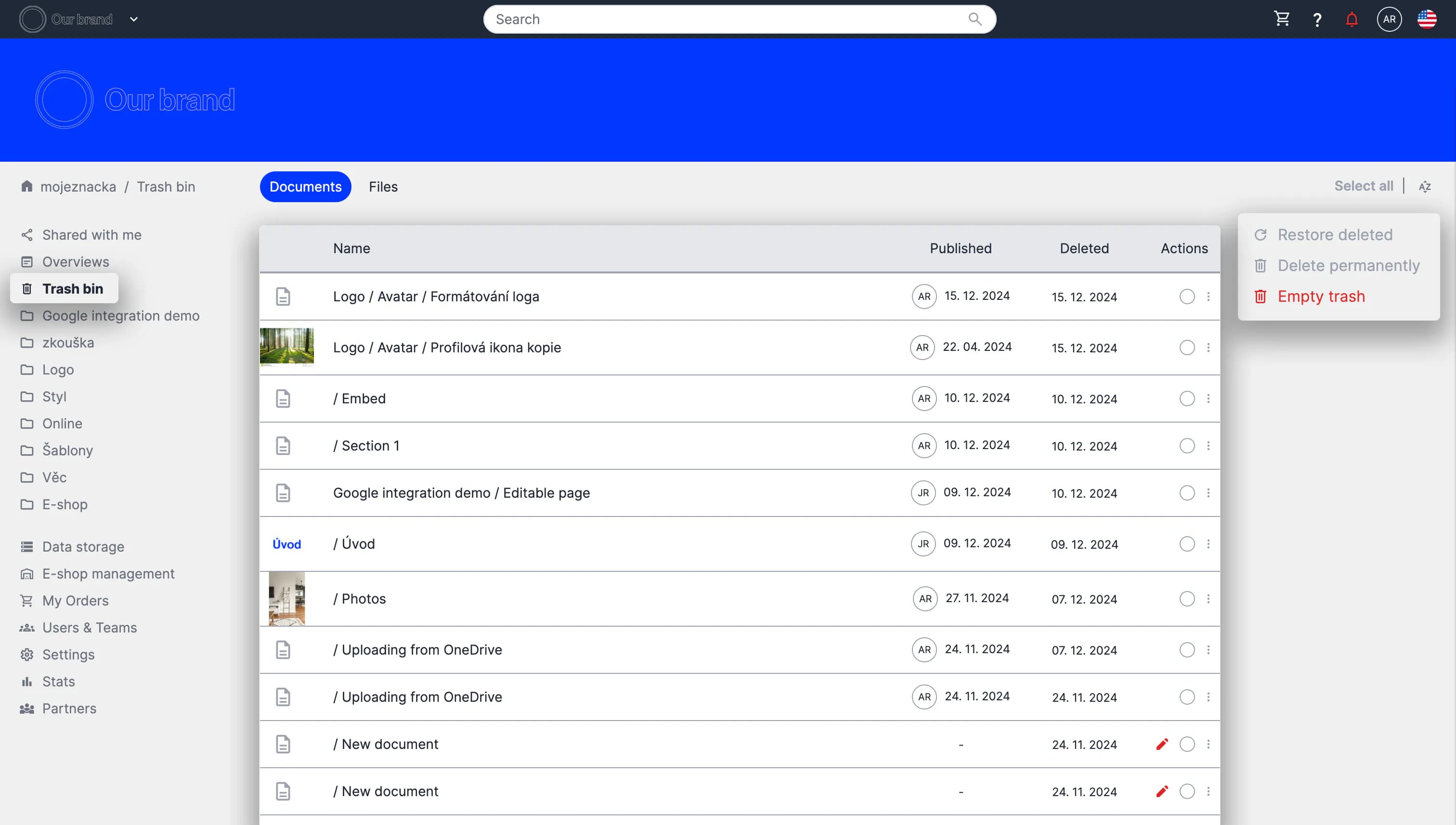 Preview of the Trash section