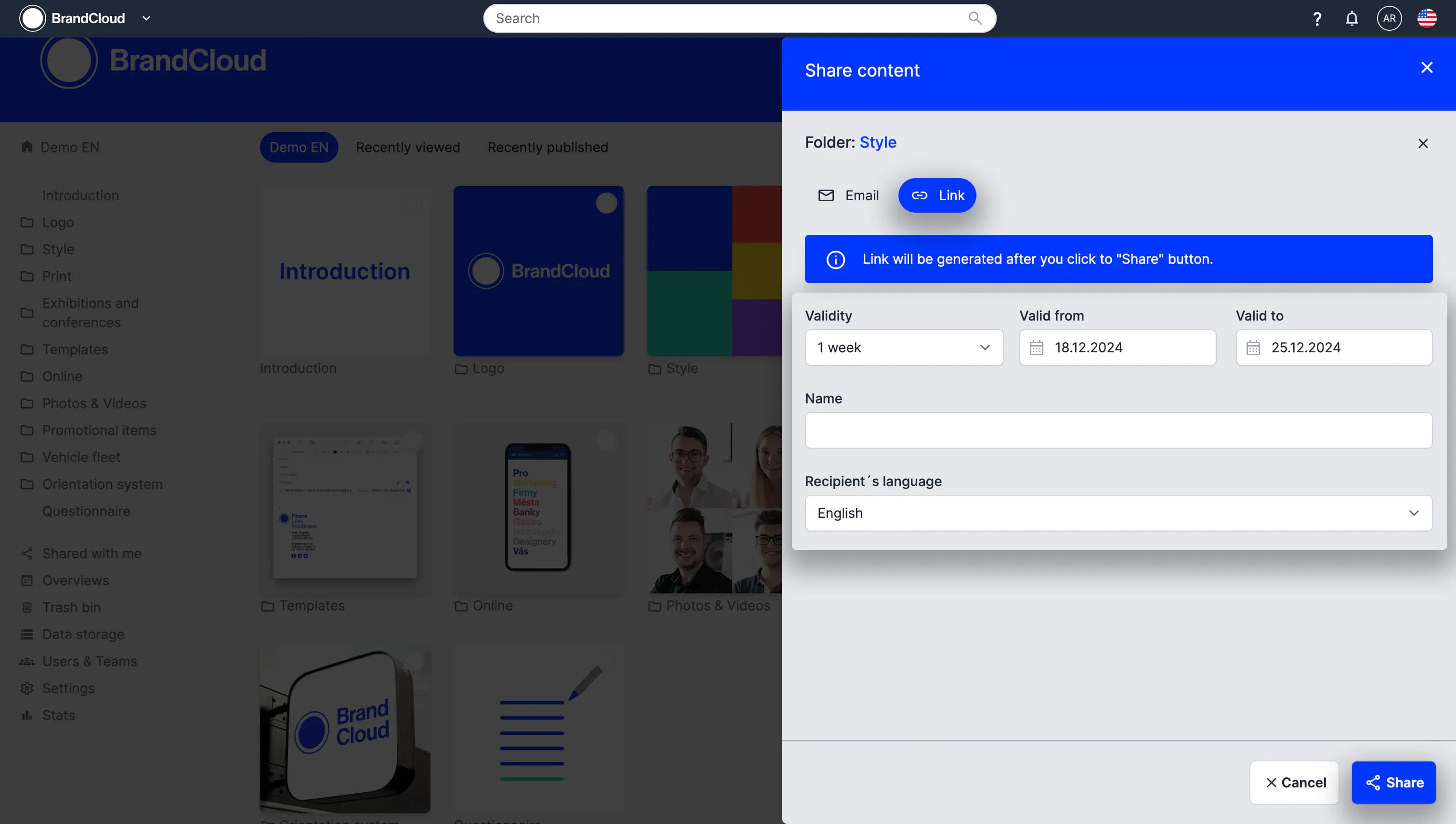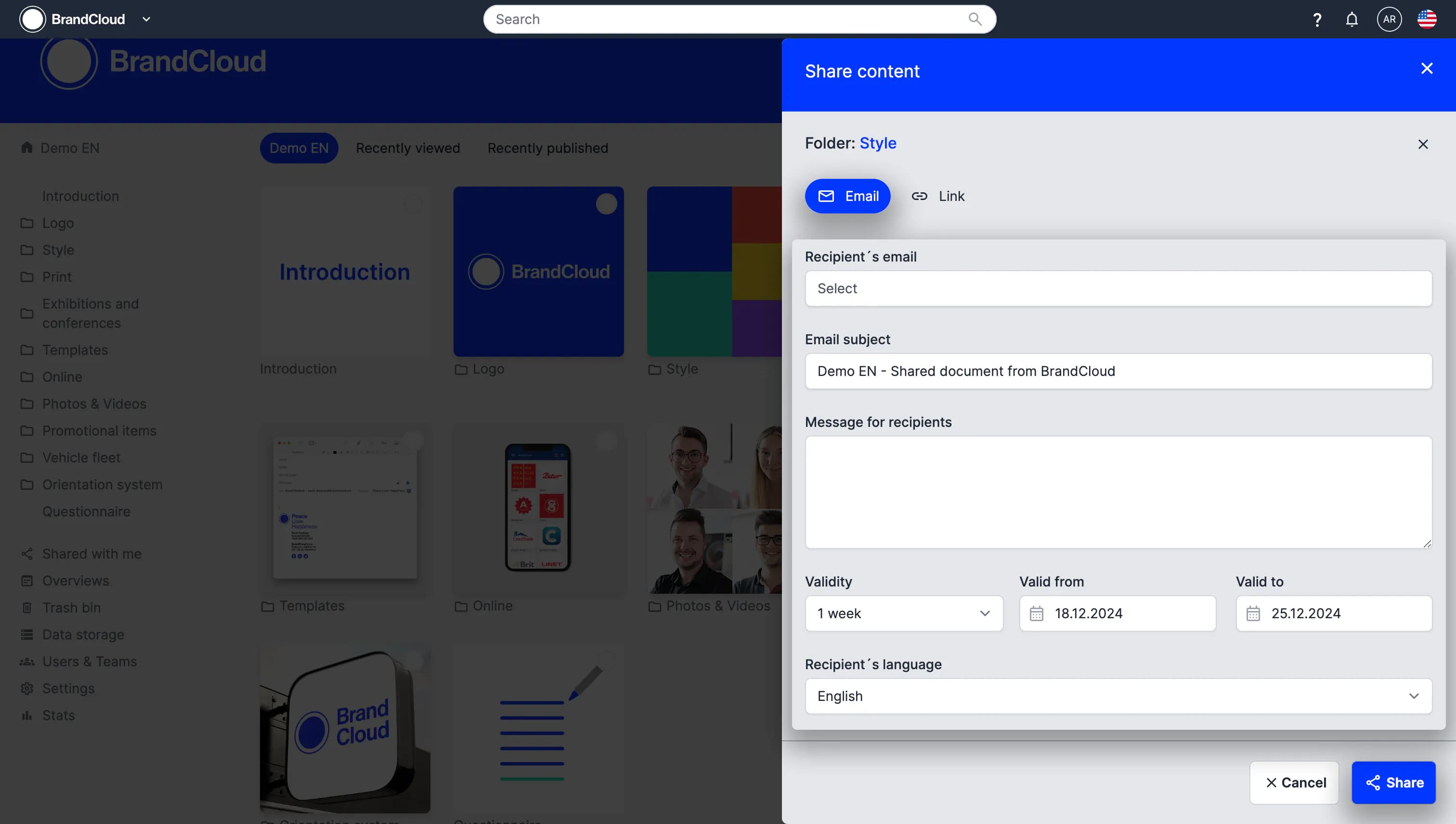 - Recipient's language - i.e. in which language the email will come to the user and also in which language BrandCloud will be opened after the share is opened