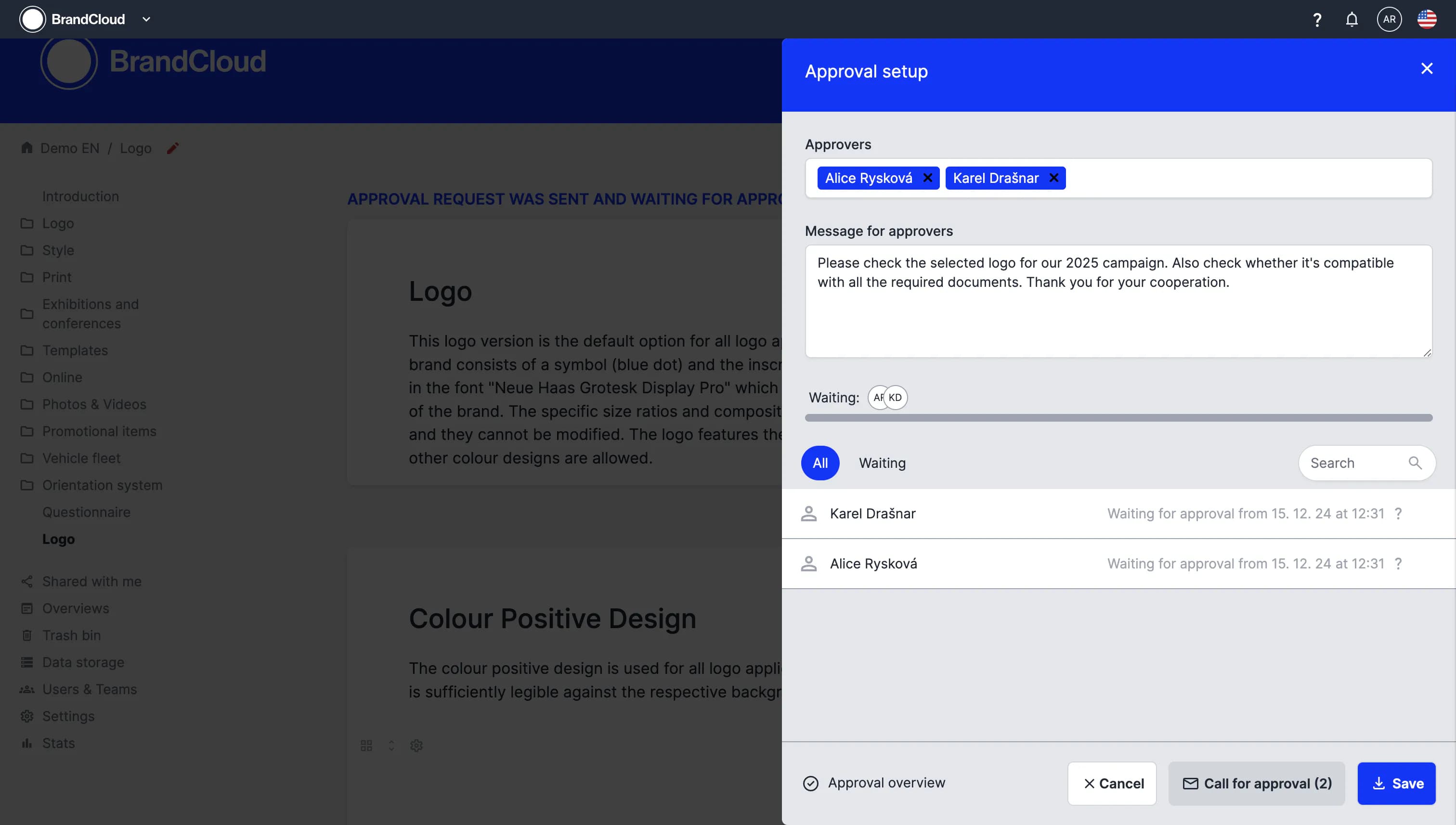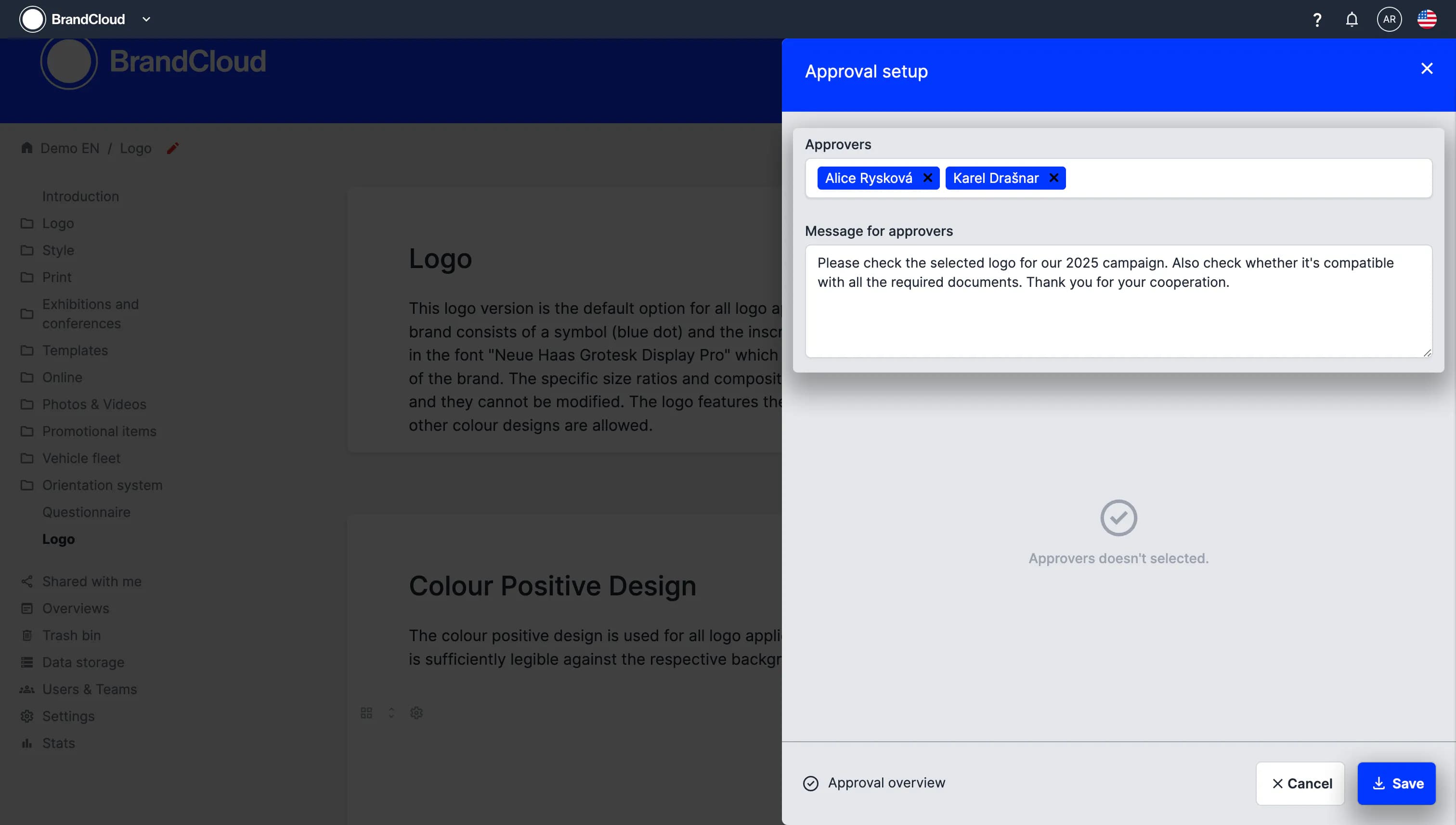 - In the pop-up window, select the approving users to whom the approval request will be sent.