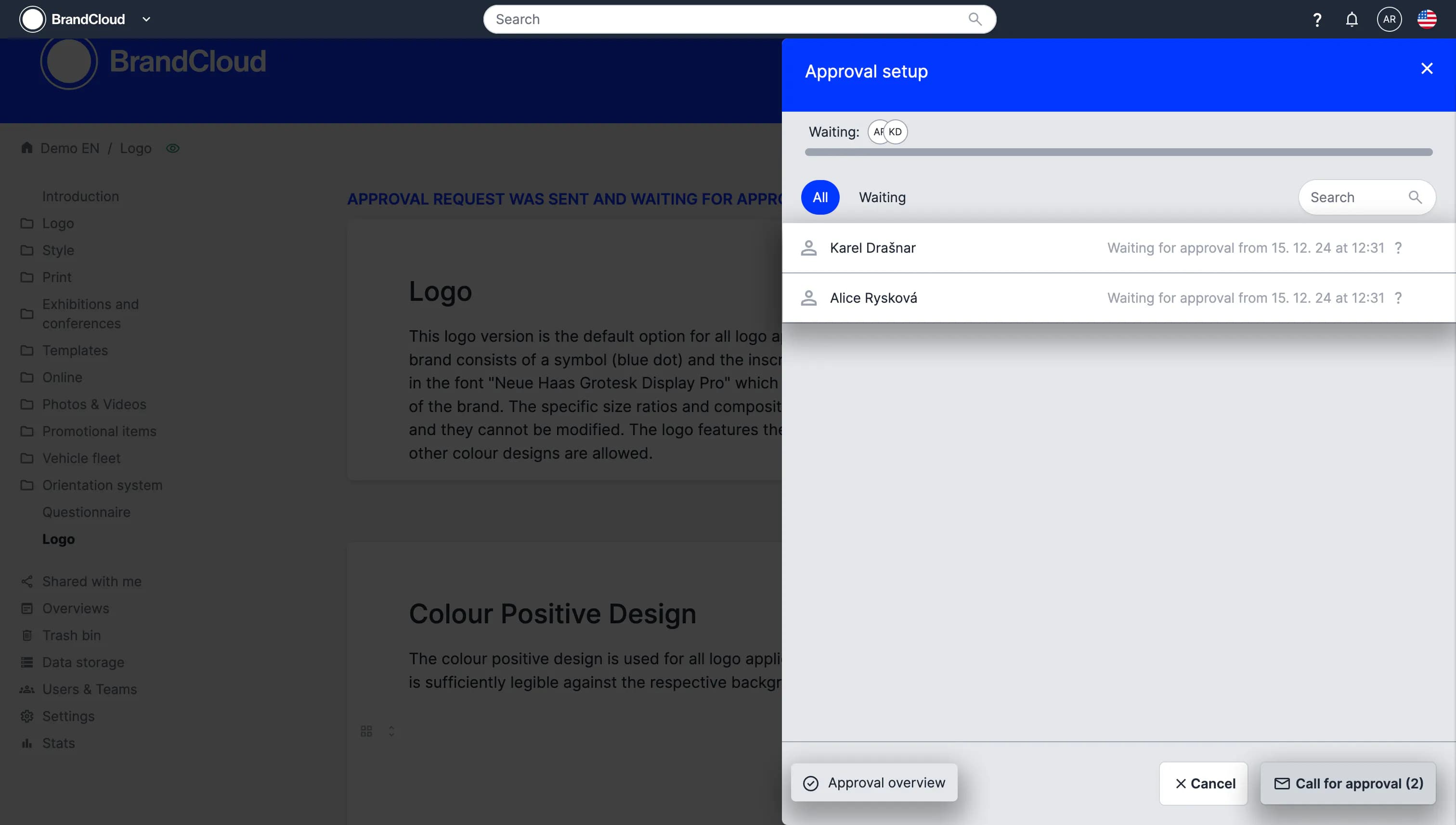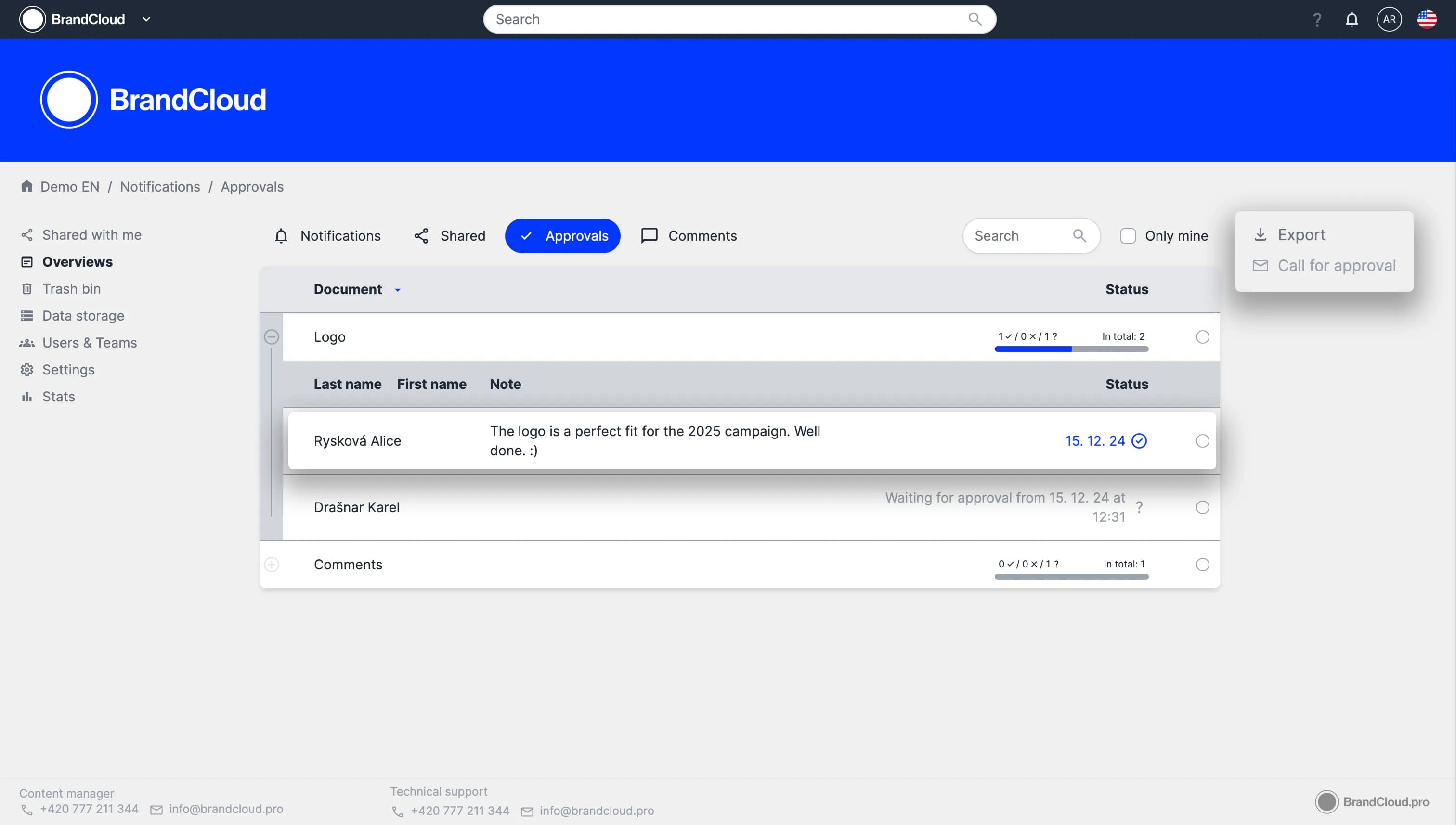 Alternatively, you can also request re-approval in the Overviews section. There, you must select the approval you wish to remind the approvers of by clicking the circle in the right-hand approval section and selecting Call for Approval in the right-hand column.