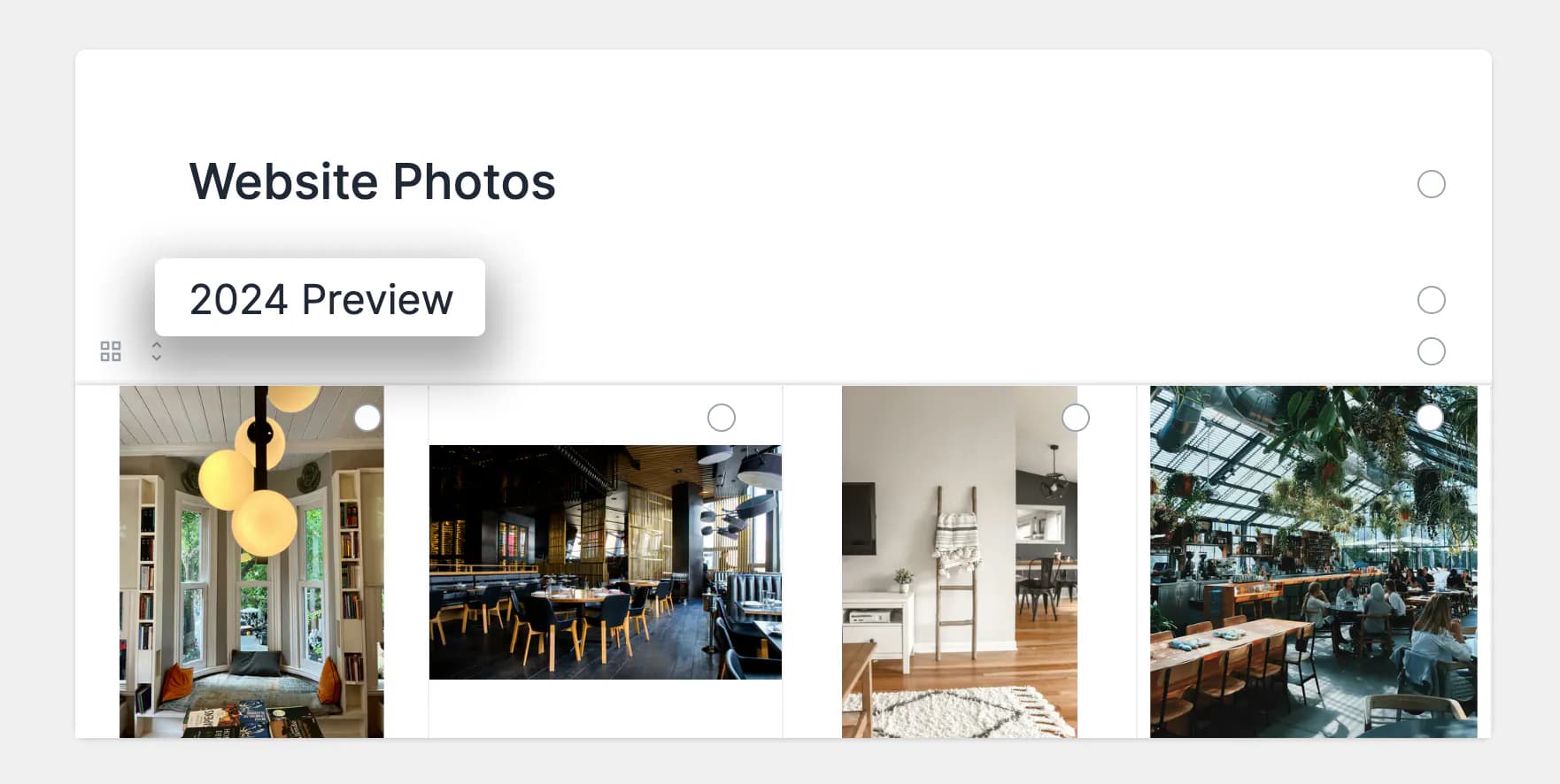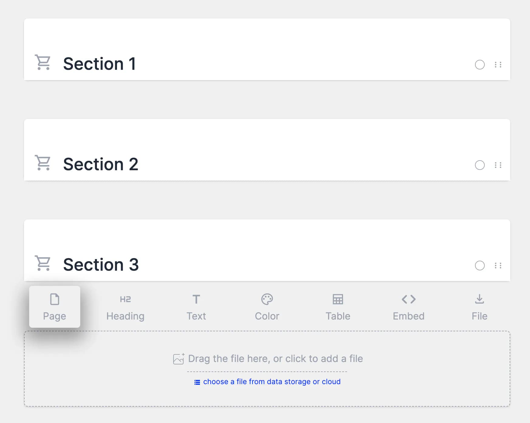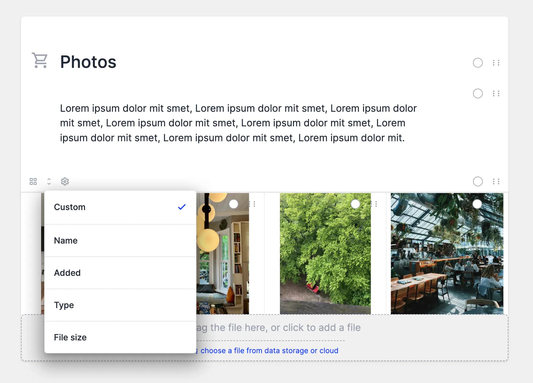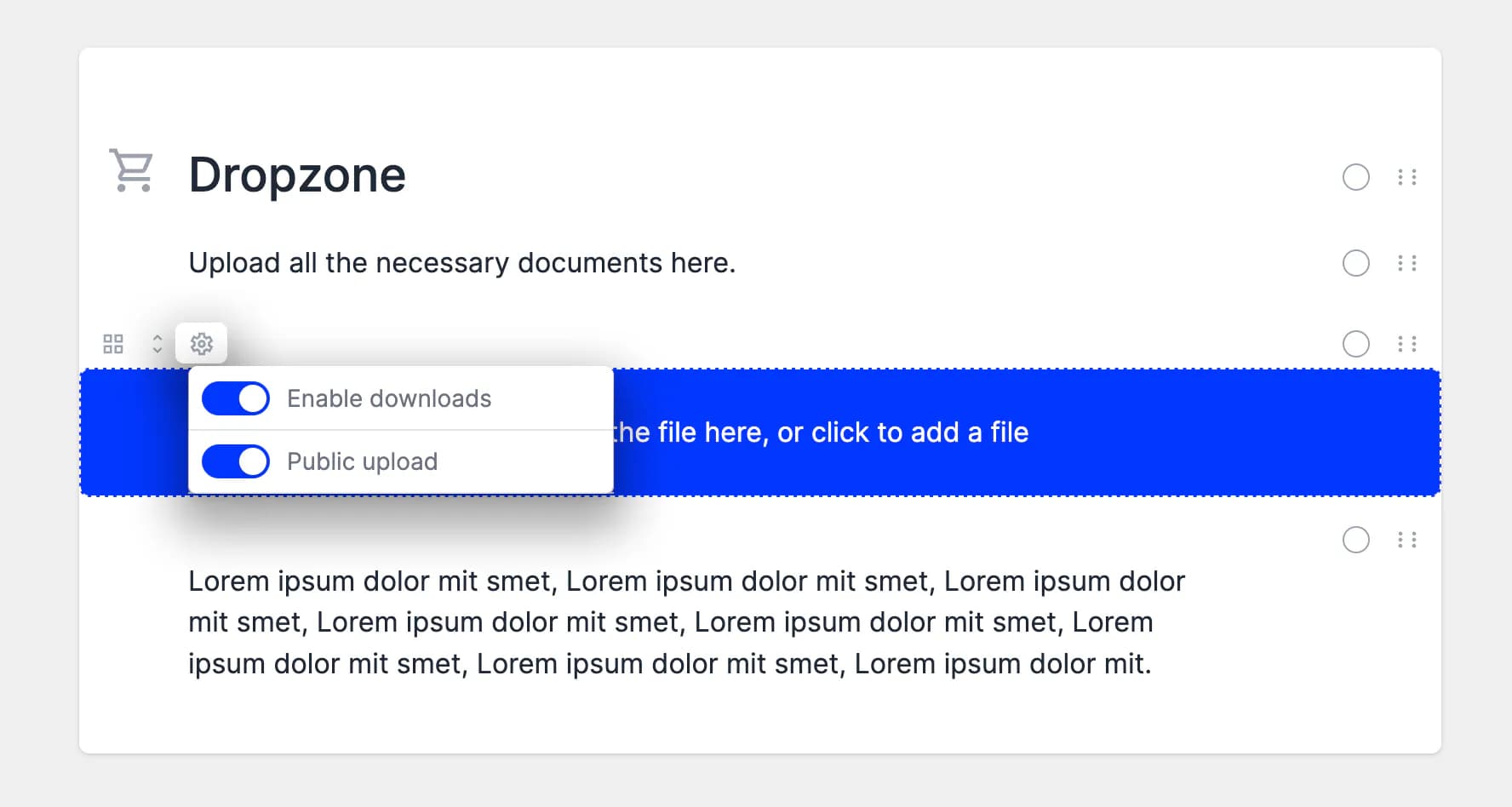 The File element serves as a place to upload your content. Whenever you place a File element on your page, you can set additional specifics for this upload space, such as preview types for uploaded content, ordering, or even disable downloading content from this space.