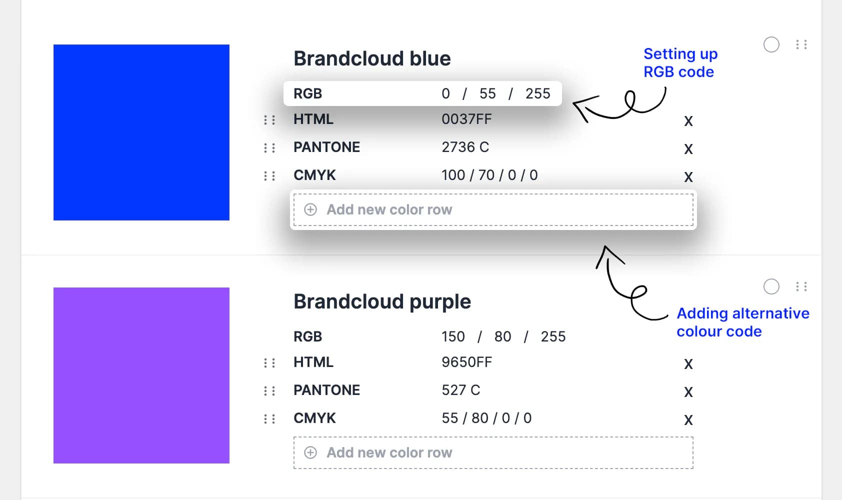 In the elements menu you can find the Color element that allows you to add any color according to its RGB or HEX code. You always have the possibility to manually add other color variations to it (e.g. HEX, CMYK...).
