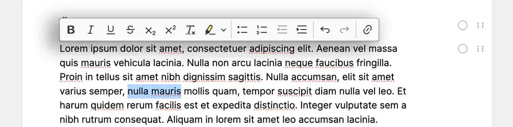- bold, italic, underline, strikethrough, subscript, superscript, highlight, remove formatting