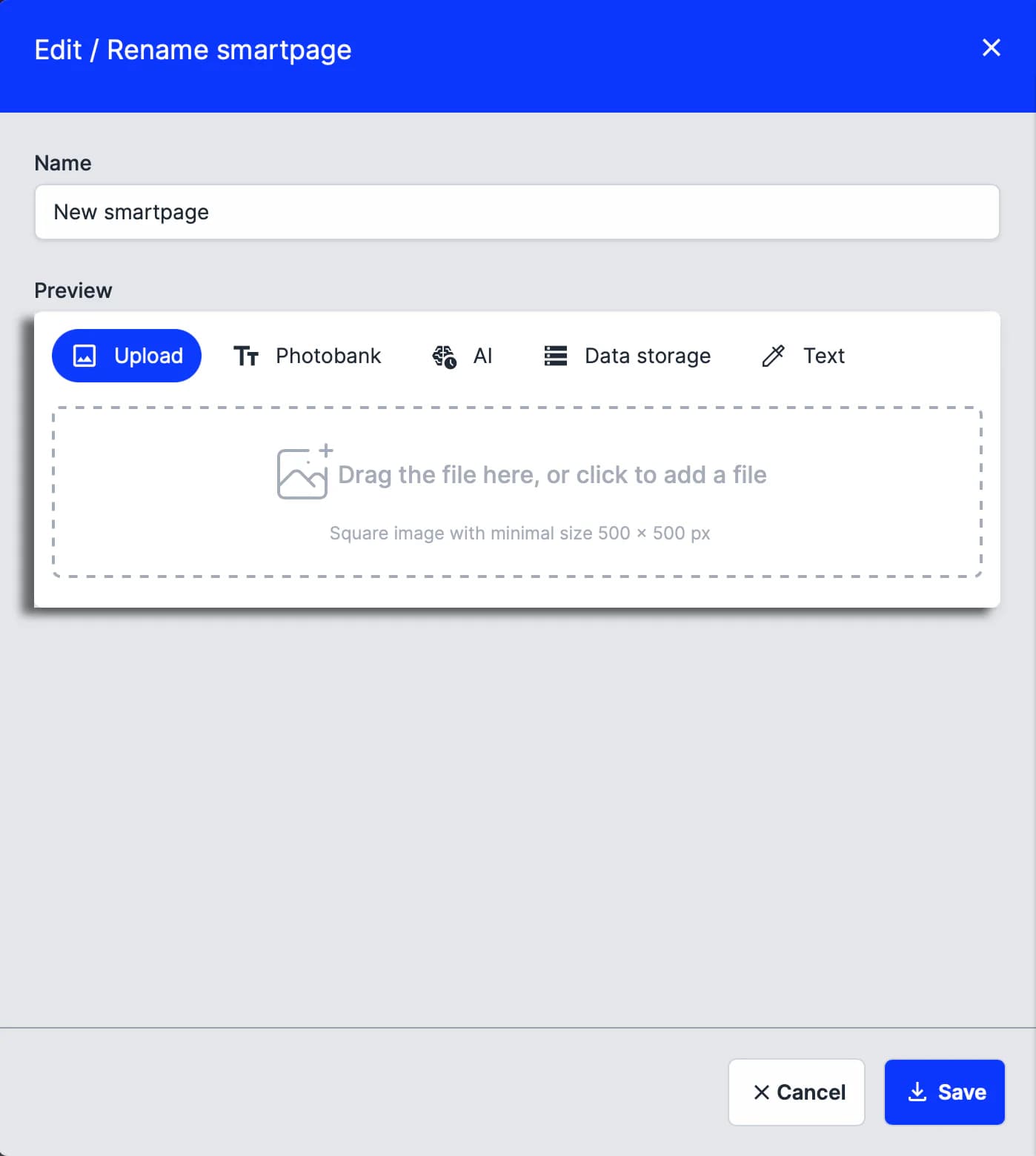 - In the edit window, update the smartpage name or upload a custom preview image.