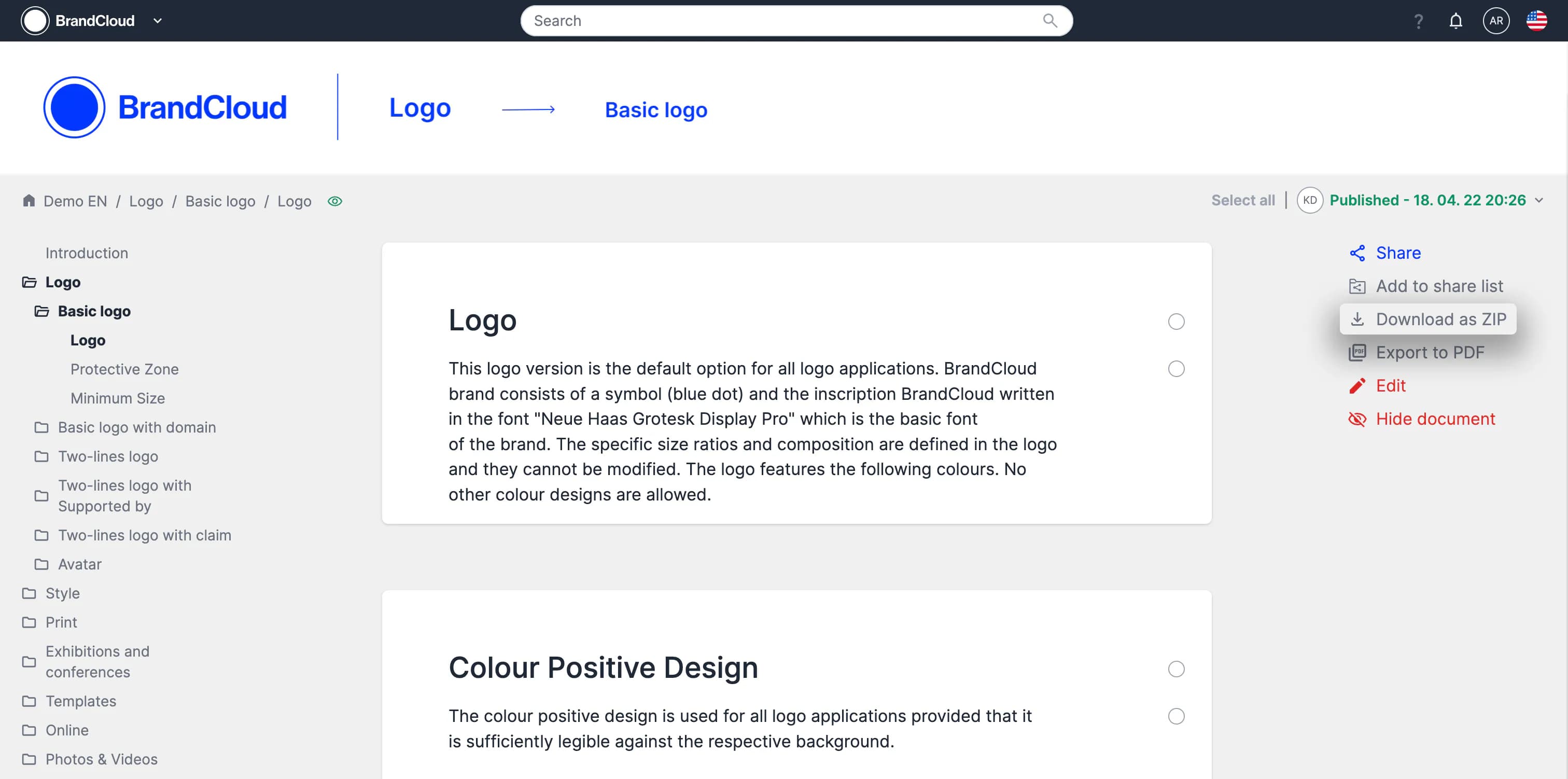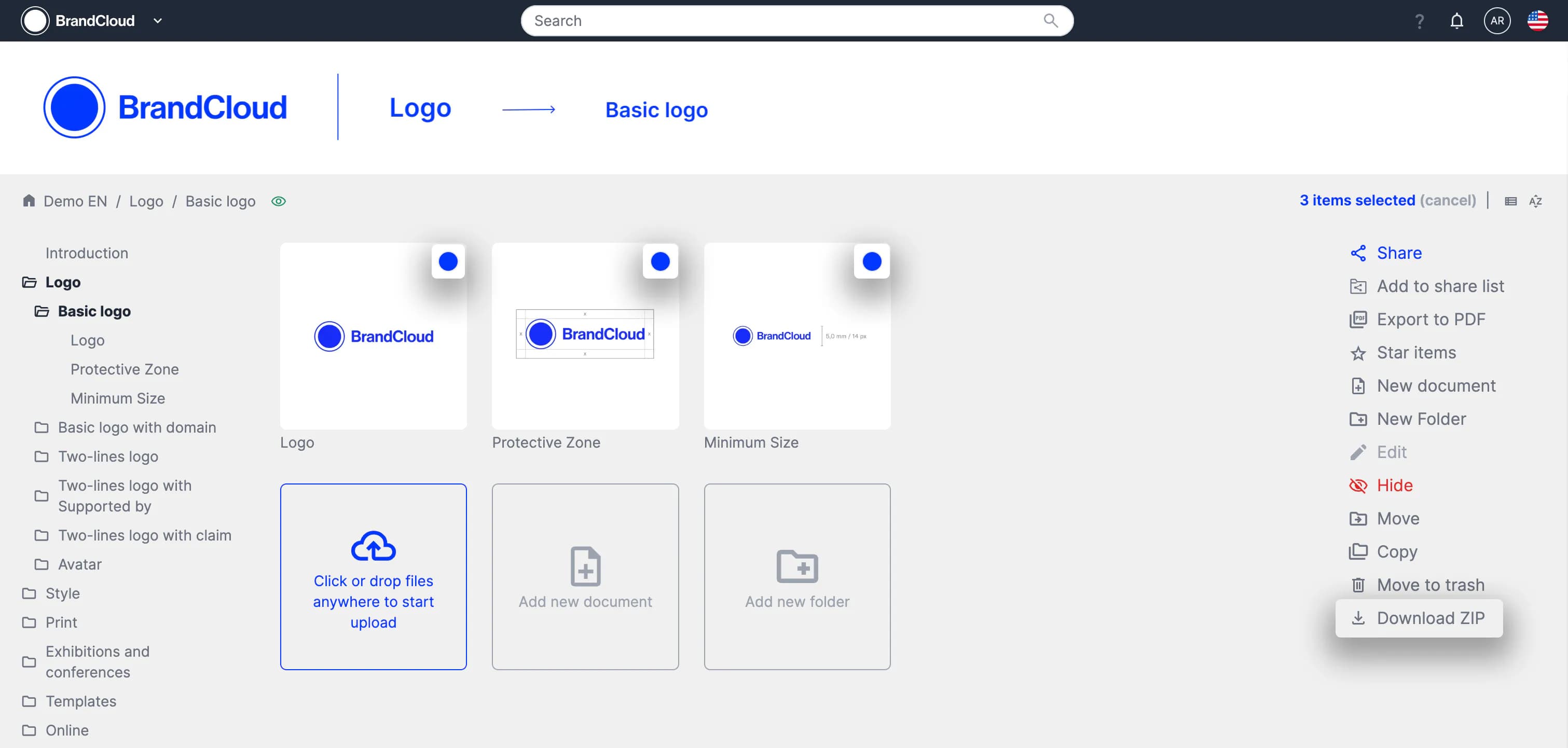 Example: you have tagged 3 smartpages containing several versions of your logo. To download all of them at once, use the Download ZIP button.
