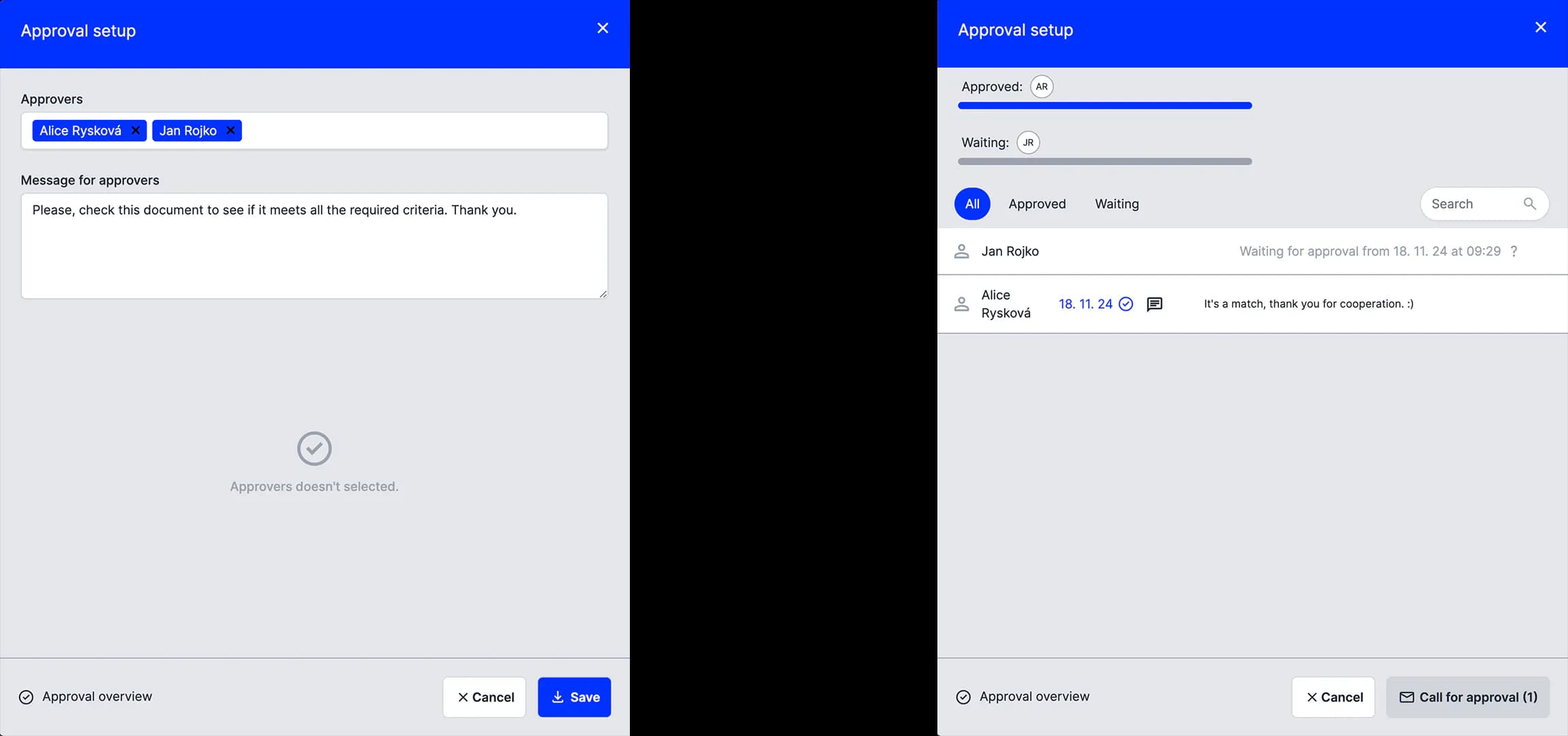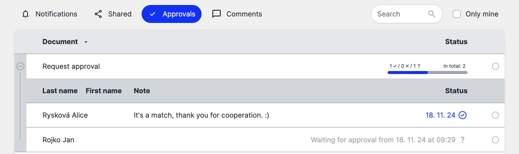 Approvals allow you to get rid of a lot of unnecessary paperwork and physical documentation. It is for approving employment contracts, proposals, tactics or plans, etc. You add / create the required content on a smartpage, turn on approvals and send the request to all required users for approval. Approvals can then be tracked not only on the smartpage, but also in Overviews where you can see the results of the approval process.