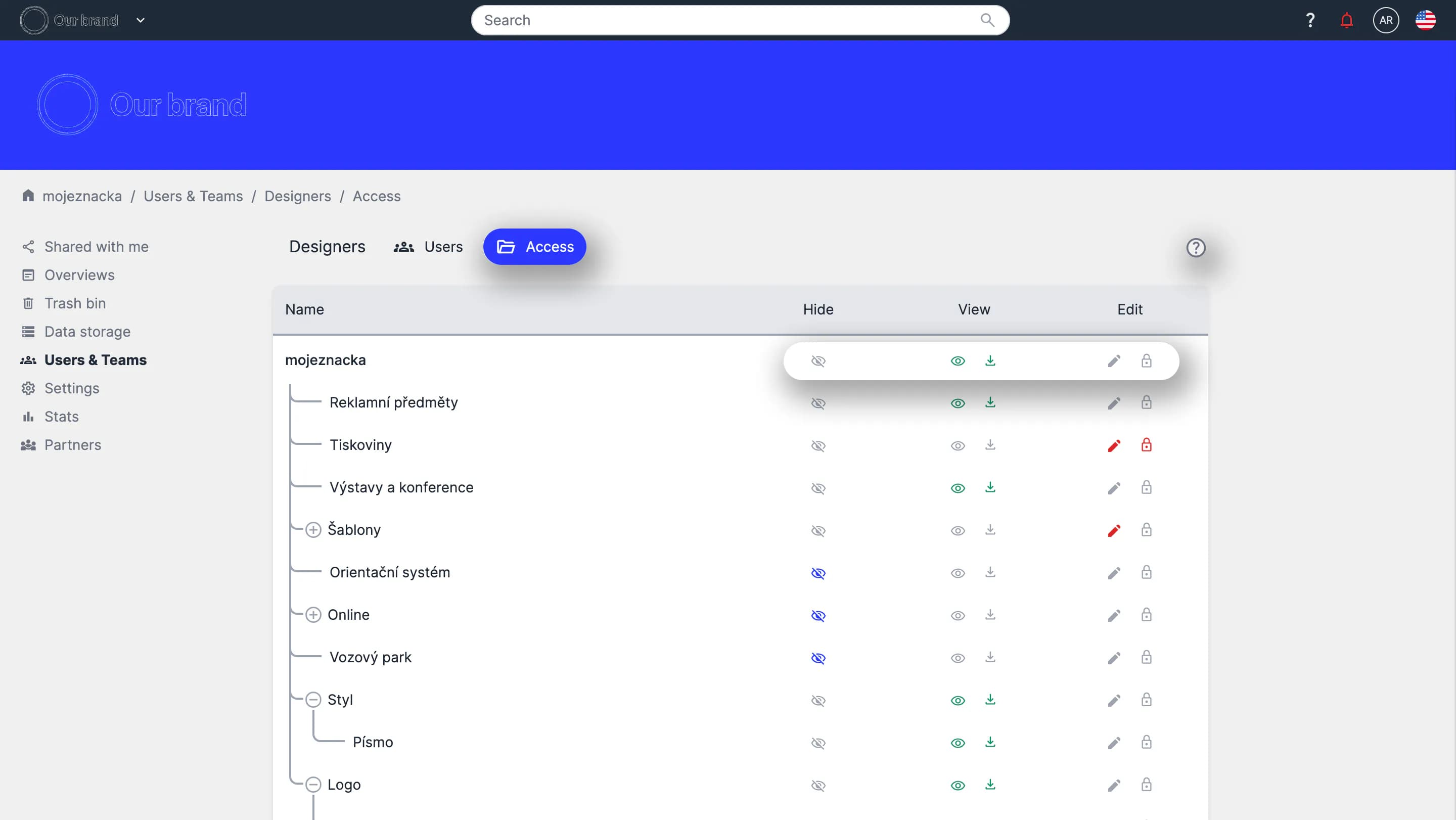 Access settings allow you to specify where each team can access, what they can see, edit, download, share and whether they can lock individual content with a password.