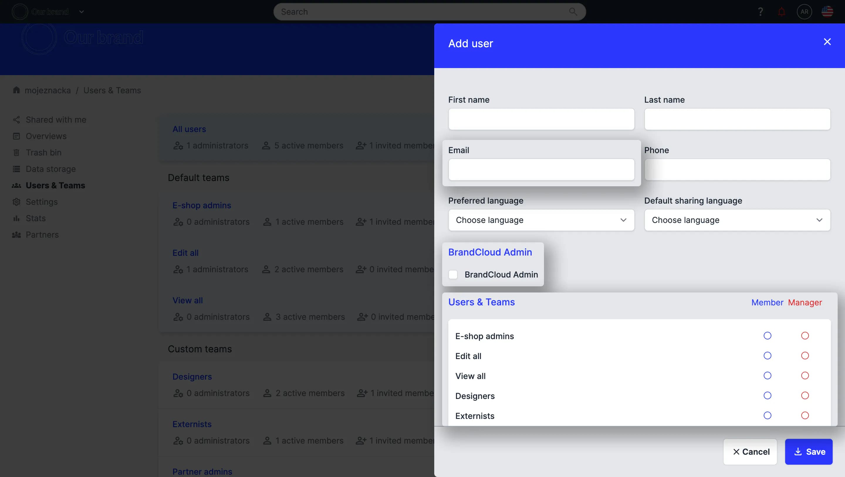 c. Administratorship: if you set the user as an administrator, they will be able to manage the entire BrandCloud including its users and teams.