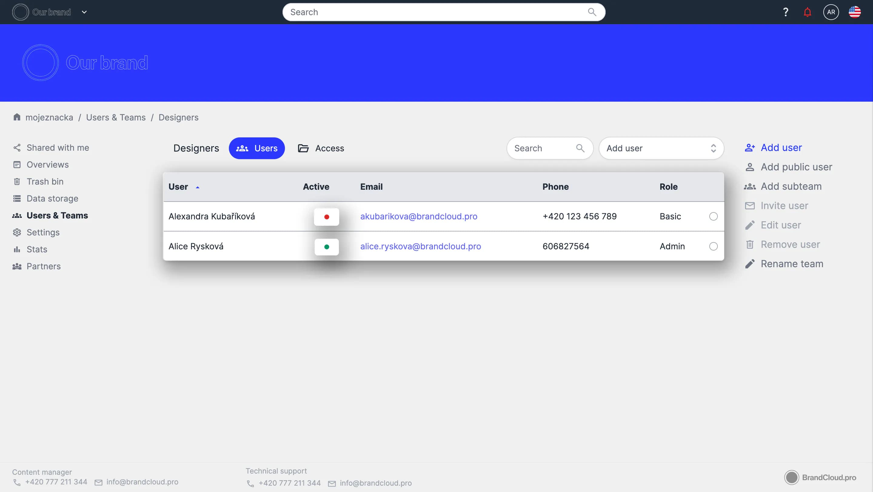 Based on your plan type, you can always add a certain number of users to your BrandCloud. You can then set different access rights to them so that the use of the storage fits your needs / your company's needs as much as possible.